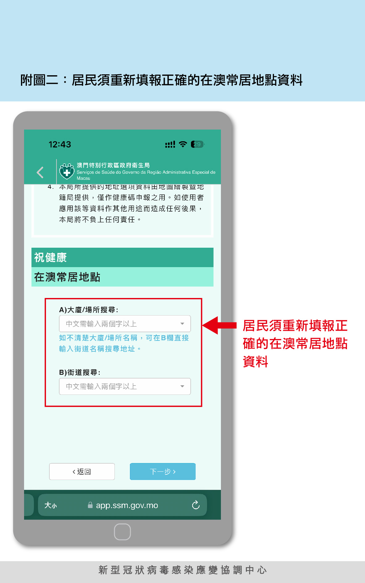應變協調中心提醒,為配合特區政府新型冠狀病毒肺炎疫情分區分級精準防疫工作,澳門居民在“澳門健康碼”上必須填寫正確的在澳常居地點資料,以便當本澳出現疫情時及時識別在受影響區域內的人士。此外,社會工作局於11月3日起在其轄下各社會工作中心為有需要人士提供更新及輸入在澳常居地點資料的協助。