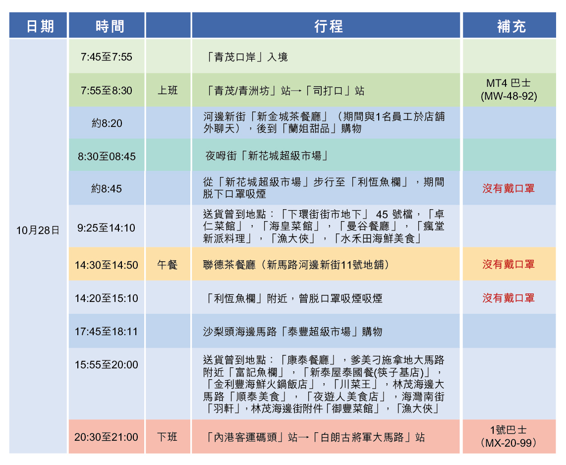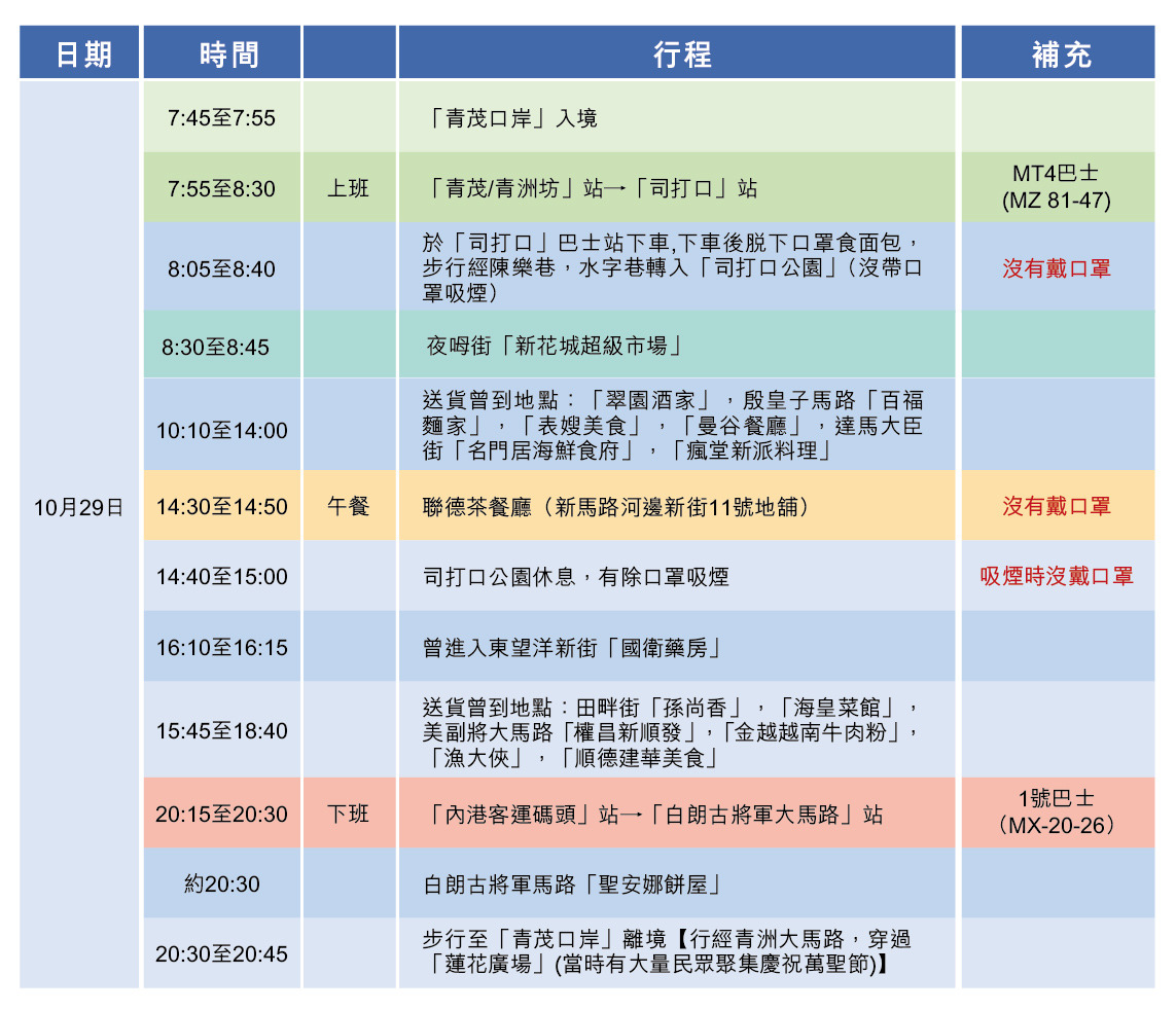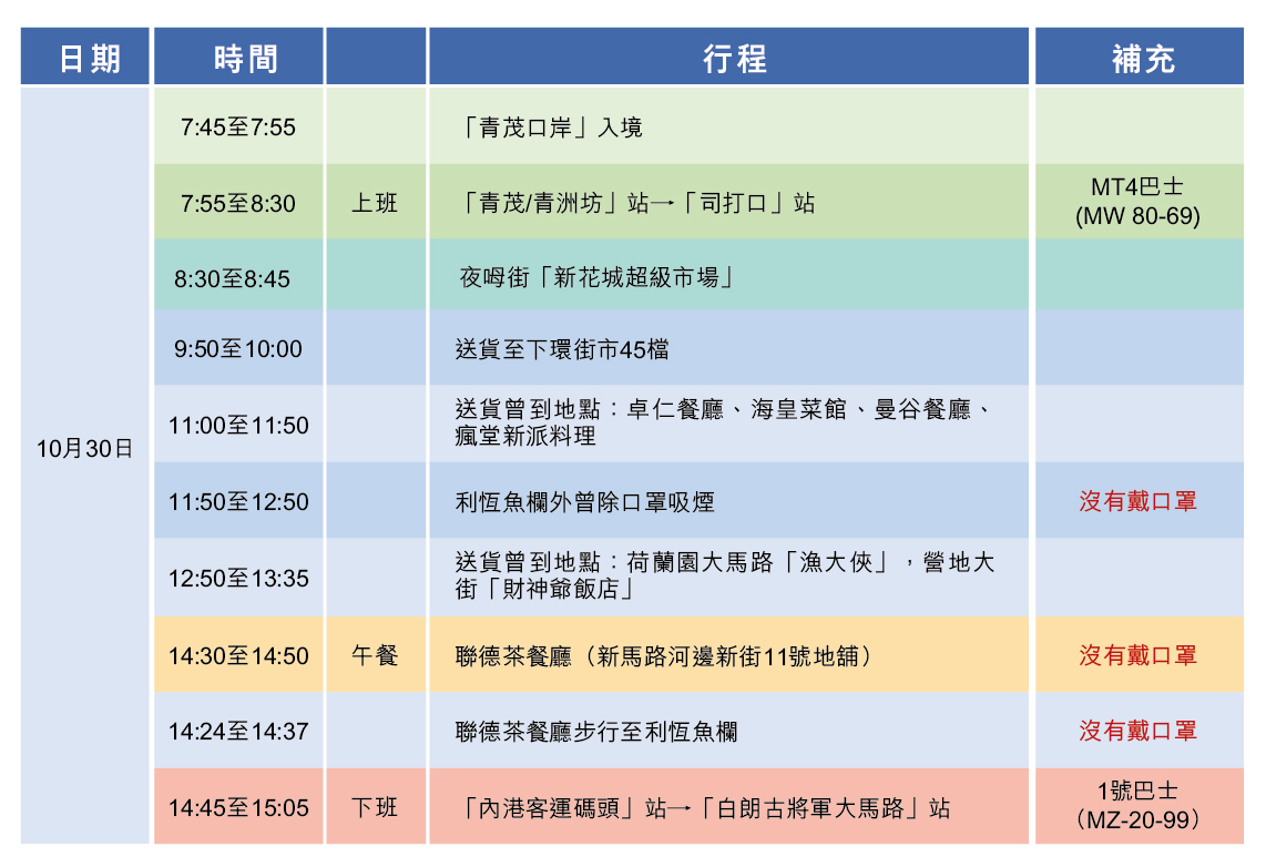 她並公布 58歲在魚欄工作的送貨員詳細行程 (見附圖1- 4),當局呼籲若市民同一時間曾去過聯德茶餐廳(新馬路河邊新街11號地舖),目前尚未接獲衛生局聯絡,應主動聯絡應變協調中心,以便評估風險和安排相應的管控措施,如曾去過行程內的其他地方,亦應主動 3天 2核檢。