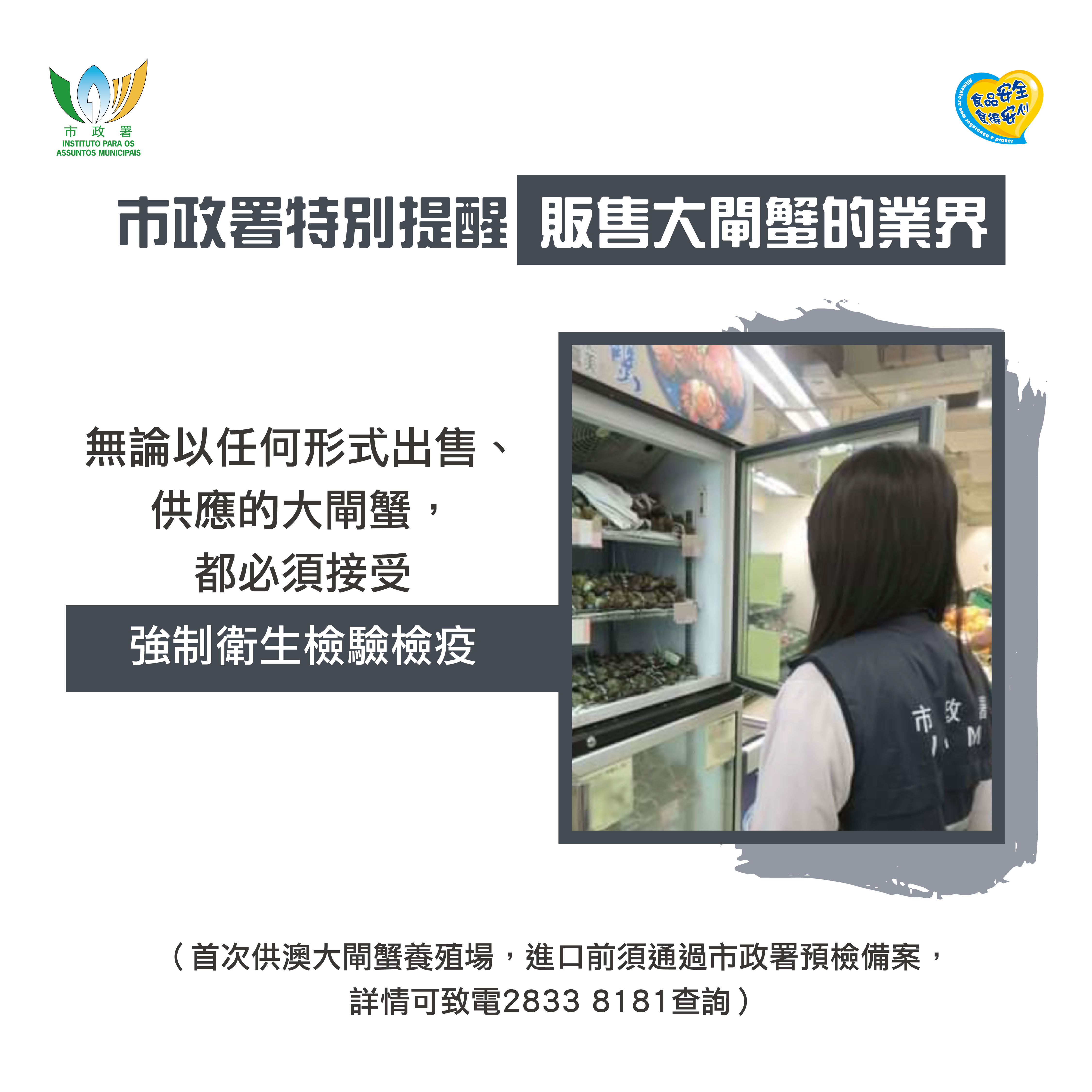 市政署持續透過嚴格的入口檢驗檢疫制度及市場巡查機制,對入口並在本澳銷售的鮮活食品嚴格把關。在大閘蟹品質安全監察方面,市政署持續與內地權限部門保持緊密聯繫,加強源頭監管。自二零一七年起,相關水產養殖場正式供貨到澳門前,須通過市政署預檢,並由來源場監管當局直接封簽才可輸澳,避免混入其他貨源。