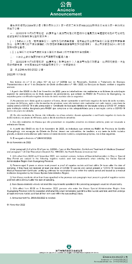 新型冠狀病毒感染應變協調中心宣佈,經考慮本地的實際需要及評估相關地區疫情風險後,衛生局根據傳染病防治法第十條第二款第(二)項及第166/2022號行政長官批示第一款的規定作出第544/A/SS/2022號公告、549/A/SS/2022號公告及終止第296/A/SS/2022號公告。自2022年11月5日零時起,由廣東省入境澳門特別行政區的人士,核酸檢測陰性證明要求如下: