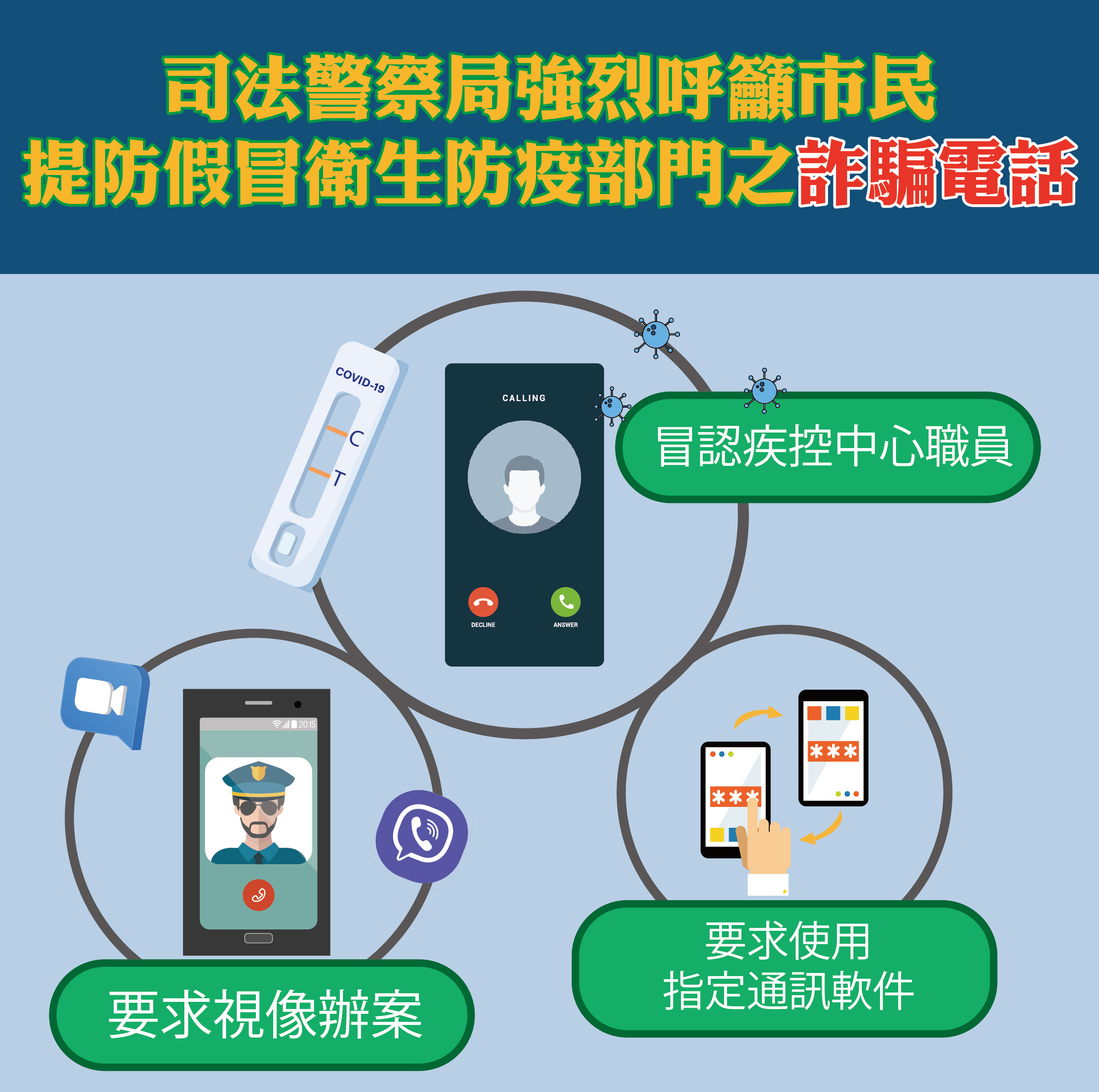 近日有市民向司法警察局舉報,指接獲來電顯示為“00”、操普通話、自稱為衛生部門人員的來電,對方聲稱根據事主在內地開立的電話號碼發現其曾與新冠肺炎確診者有共同活動軌跡,需要安排其進行隔離,或指其曾作出涉及疫情的違法行為,並以懷疑其個人資料被盜用為由,將通話轉接至“內地公安”,過程中更要求事主下載手機通訊應用程式進行視頻通話。通話期間,對方訛稱事主牽涉巨額案件,要求提供證件號碼及電話號碼作核對。事主感可疑,隨即掛線並向司警局報案求助。