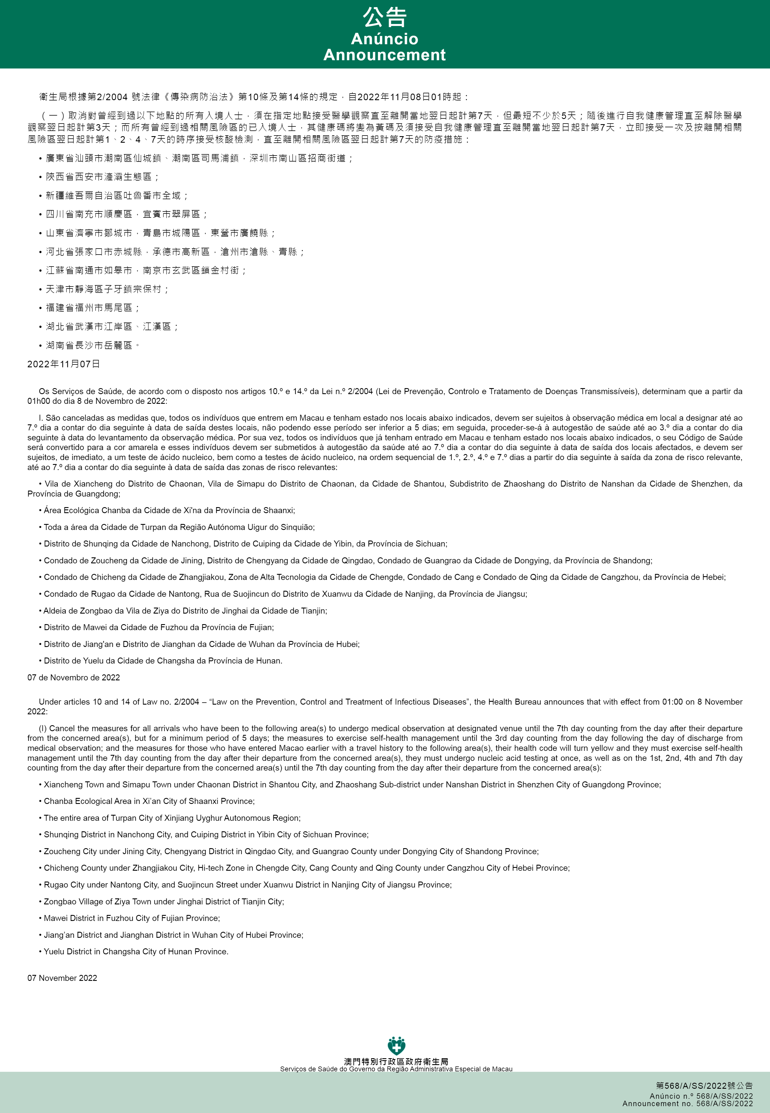 新型冠狀病毒感染應變協調中心(下稱應變協調中心)宣佈,因應內地的疫情變化,衛生局根據第2/2004號法律《傳染病防治法》第10條和第14條的規定,自2022年11月8日凌晨1時起,新增或取消對曾到內地相關區域人士的防疫措施: