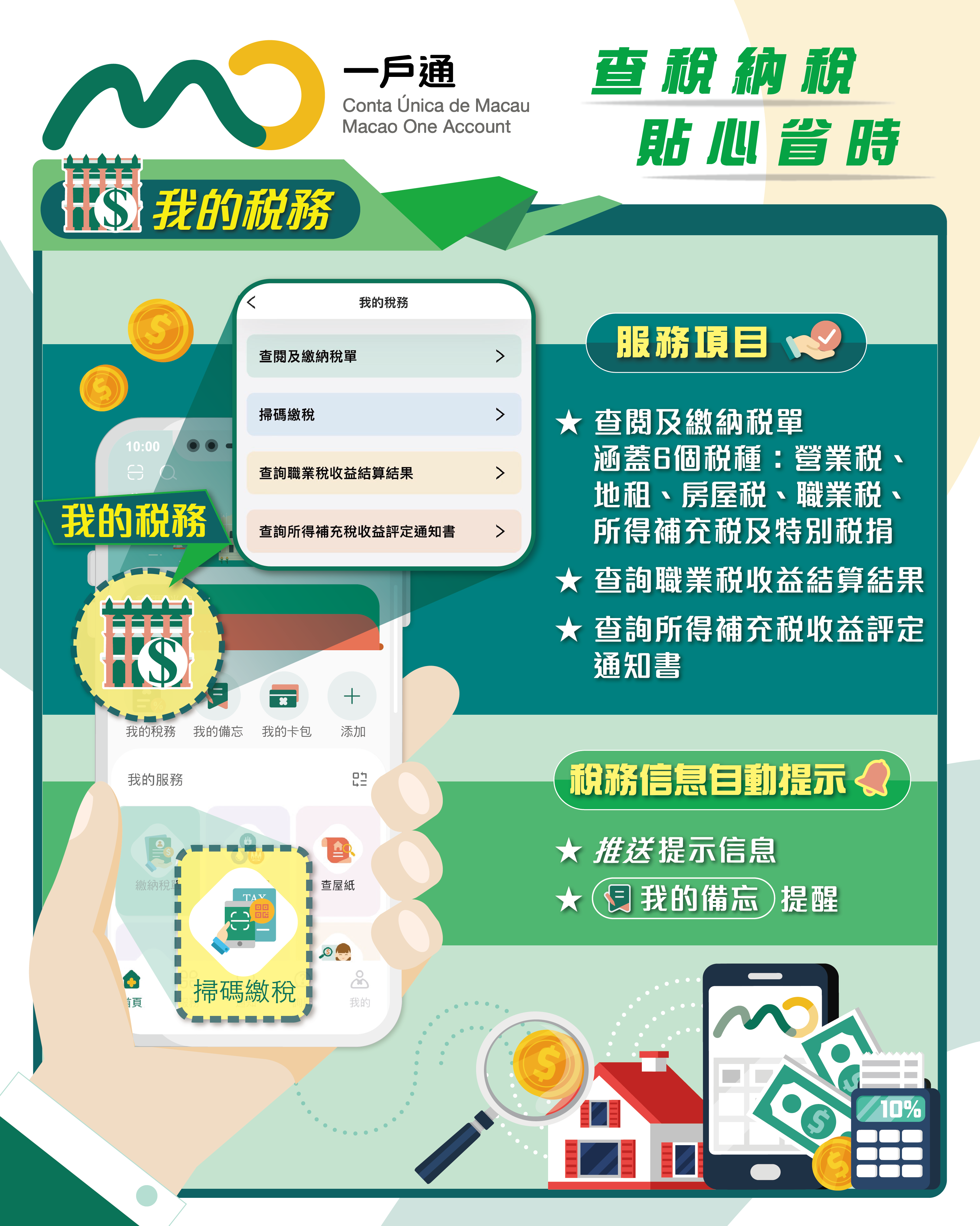 納稅人登入“一戶通"手機應用程式後,便可在“我的稅務"中查閱和繳納名下稅單,涵蓋範圍包括營業稅、地租、房屋稅、職業稅、所得補充稅的定期稅單,以及特別稅捐的不定期憑單。
