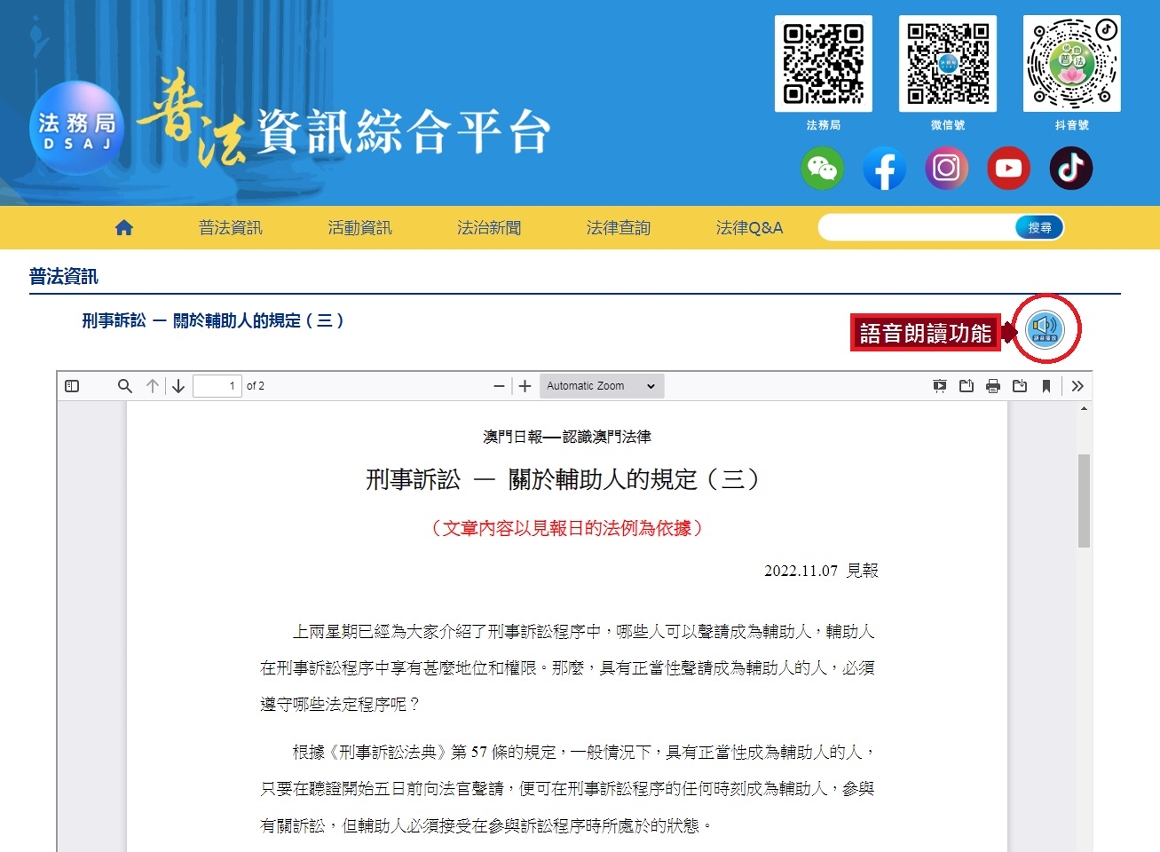 新平台提供包括憲法、基本法、民法、刑法、商法、勞動關係法等普法宣傳品和法律常見問題,以及法務局的活動消息、各政府部門及粵港澳大灣區的普法資訊和法治新聞等內容,市民可按不同法律範疇和宣傳品類型篩選所需的資訊。此外,新平台還設有語音朗讀功能,市民可透過人聲導讀收聽法律文章和法治新聞。