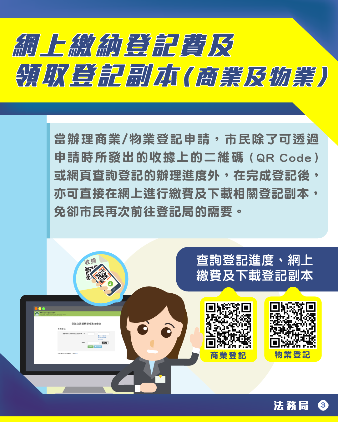 在有關繳納費用方面,法務局於今年11月陸續推出網上繳交商業和物業登記費用服務,市民在辦理商業或物業登記申請後,可透過收據上的二維碼或網頁查詢登記的辦理進度,當登記完成後,即可直接在網上作出繳費及下載相關登記副本,方便快捷,毋須再多走一趟到登記局繳費及領取登記副本。商業登記進度查詢、繳費及下載登記副本的網址為:https://eservice.dsaj.gov.mo/dsajservice/piweb/pages/crcbm-reg.htm;物業登記進度查詢、繳費及下載登記副本的網址為https://eservice.dsaj.gov.mo/dsajservice/piweb/pages/crp-reg.htm。
