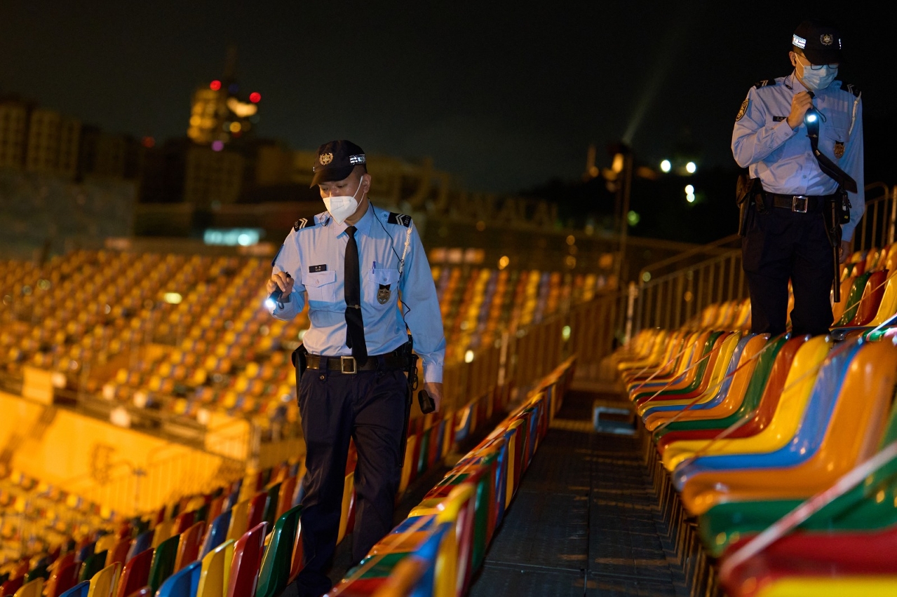 今日清晨,賽事安保工作的全體警務人員進行列隊,聽取工作安排後,隨即前往各點執行工作,封閉賽道及進行安全監察;特警隊警犬組於賽道及看台等範圍排查可疑物品,確保整個賽道和周邊區域的安全。