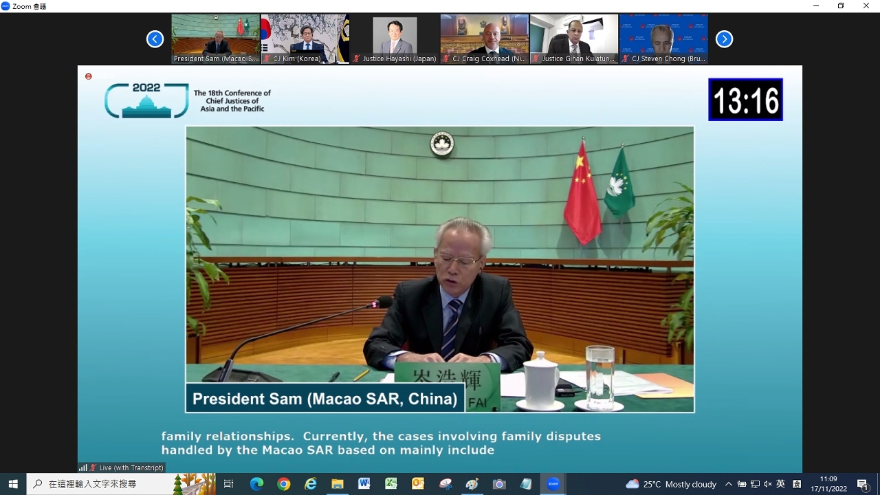 第十八屆亞太區首席法官會議於2022年11月16日至17日以線上形式舉行。應香港特區首席法官張舉能和亞太法律協會司法部主席Andrew Bell邀請,終審法院院長岑浩輝以視頻方式出席了本次會議。