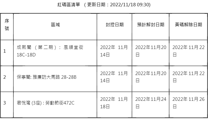 紅碼區清單 (更新日期:2022/11/18 09:30)
