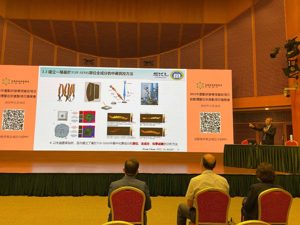 啟動禮後隨即舉行在研重點資助項目的匯報會,邀請了前年獲資助的三個項目的團隊匯報中期研究情況及階段性研究成果,項目分別為一、澳門科技大學姜志宏教授團隊 的“融合人工智能和多組學技術開展川貝母等六種中藥的多維度質量控制研究”;二、澳門大學李紹平教授團隊的“中藥國際標準研究與制訂”;三、澳門大學李銘源教授團隊的“抗神經退行性病的天然小分子化合物 PD-001的研發”。