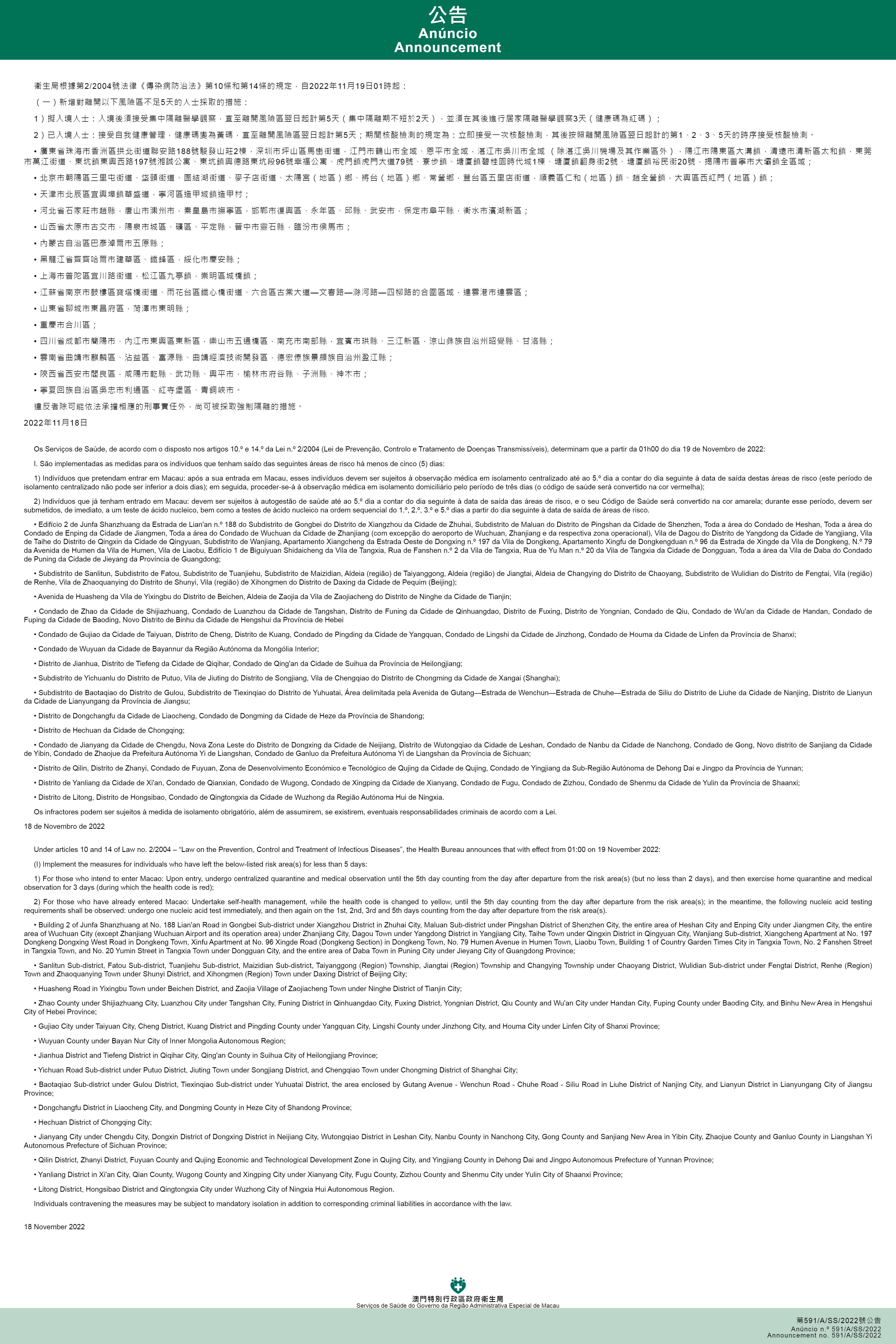 新型冠狀病毒感染應變協調中心(下稱應變協調中心)宣佈,因應內地的疫情變化,衛生局根據第2/2004號法律《傳染病防治法》第10條和第14條的規定,自2022年11月19日凌晨1時起,新增或取消對曾到內地相關區域人士的防疫措施: