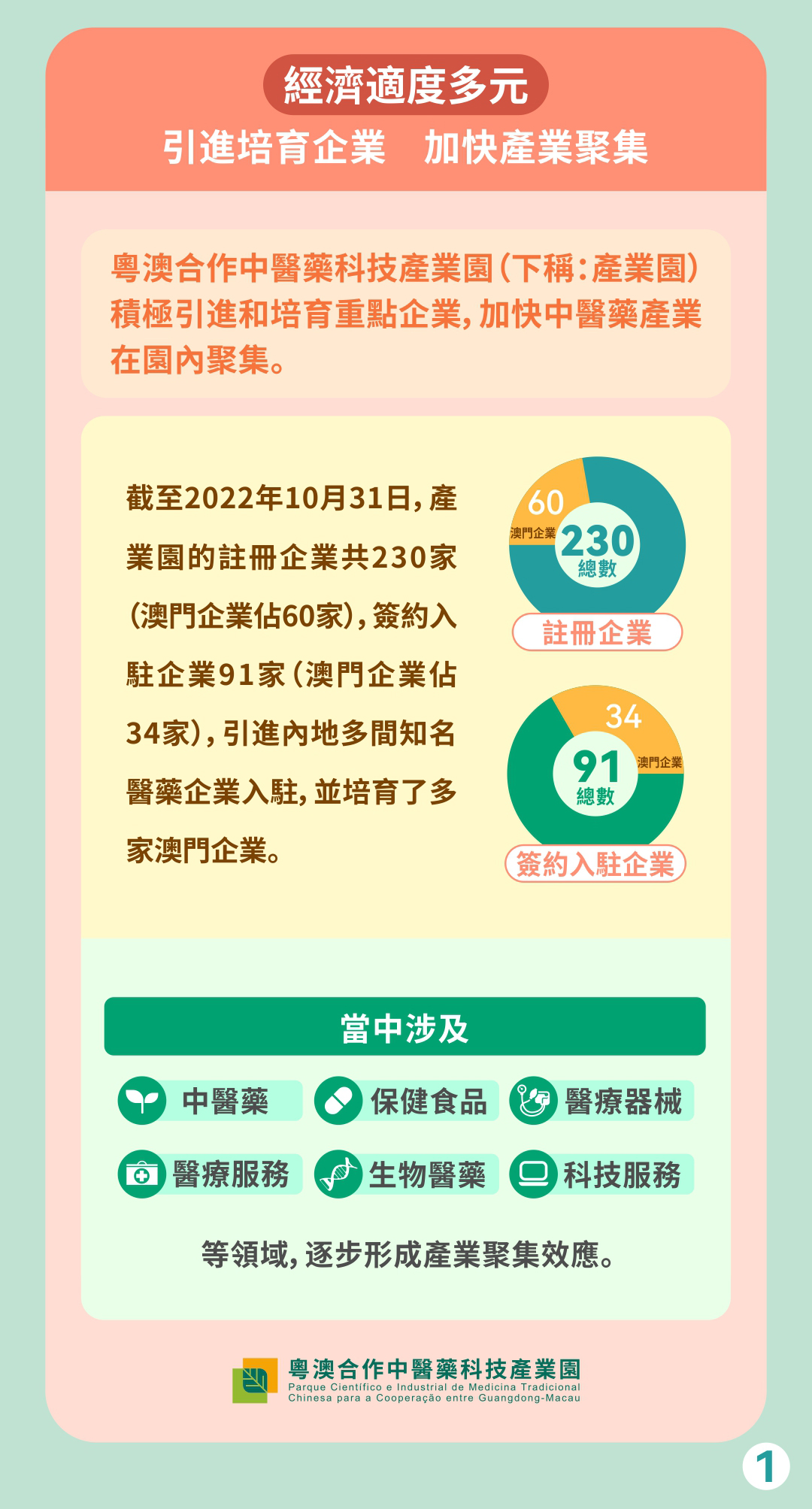 產業園積極引進和培育重點企業,加快中醫藥產業在園內聚集。截至2022年10月31日,產業園的註冊企業共230家(其中澳門企業60家),簽約入駐企業91家(其中澳門企業34家),引進內地多間知名醫藥企業入駐,並培育了一定數量的澳門企業,當中涉及中醫藥、保健食品、醫療器械、醫療服務、生物醫藥、科技服務等領域,逐步形成產業聚集效應。