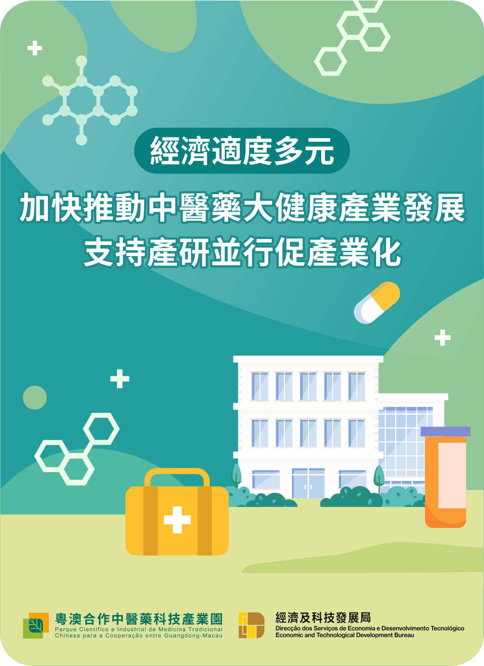 特區政府以中醫藥研發製造為切入點,培育發展大健康產業,粵澳合作中醫藥科技產業園和經濟科技發展局積極推進產業發展,特別為本澳中醫藥製造產業提供相應的支持,以促進本澳經濟適度多元化發展。