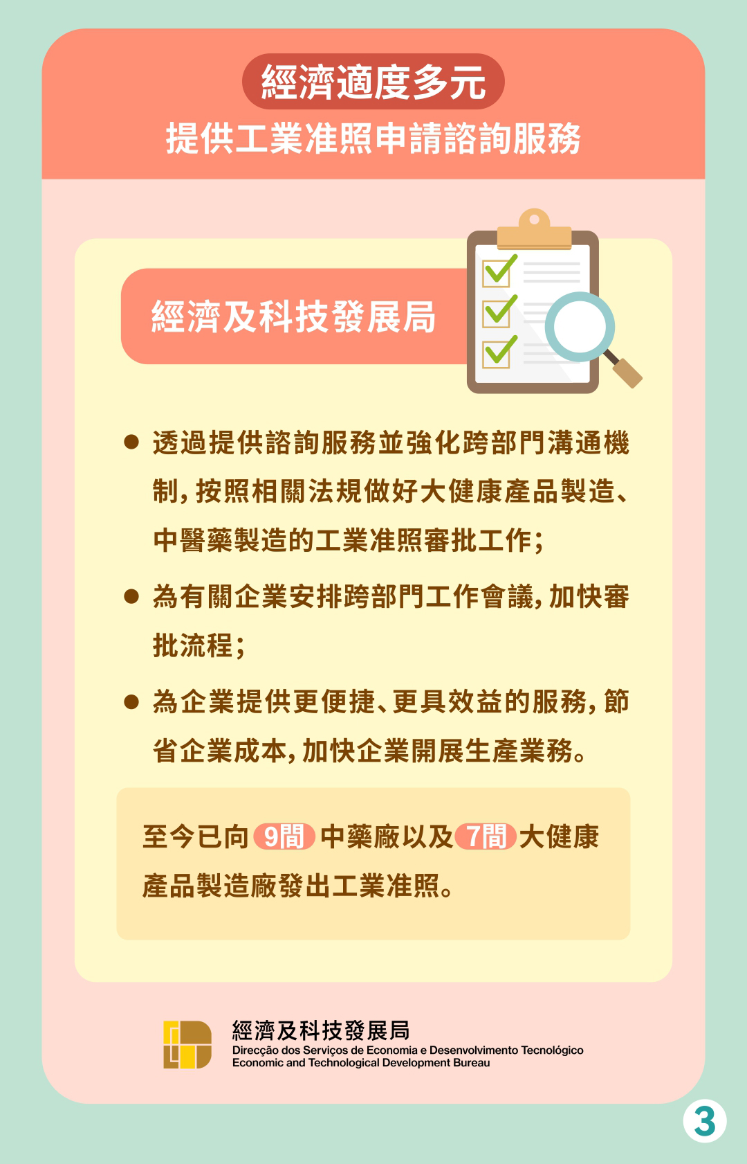 經科局透過提供諮詢服務並強化跨部門溝通機制,按照相關法規做好大健康產品製造、中醫藥製造的工業准照審批工作,為有關企業安排跨部門工作會議,加快審批流程,為企業提供更便捷、更具效益的服務,節省企業成本,加快企業開展生產業務。至今已向9間中藥廠以及7間大健康產品製造廠發出工業准照。