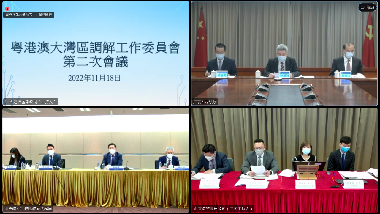 粵港澳大灣區調解工作委員會於11月18日以視像方式舉行第二次會議,澳門特區政府法務局局長劉德學、香港特區政府律政司署理副民事法律專員李照庭、廣東省司法廳副廳長林楚明等出席。
