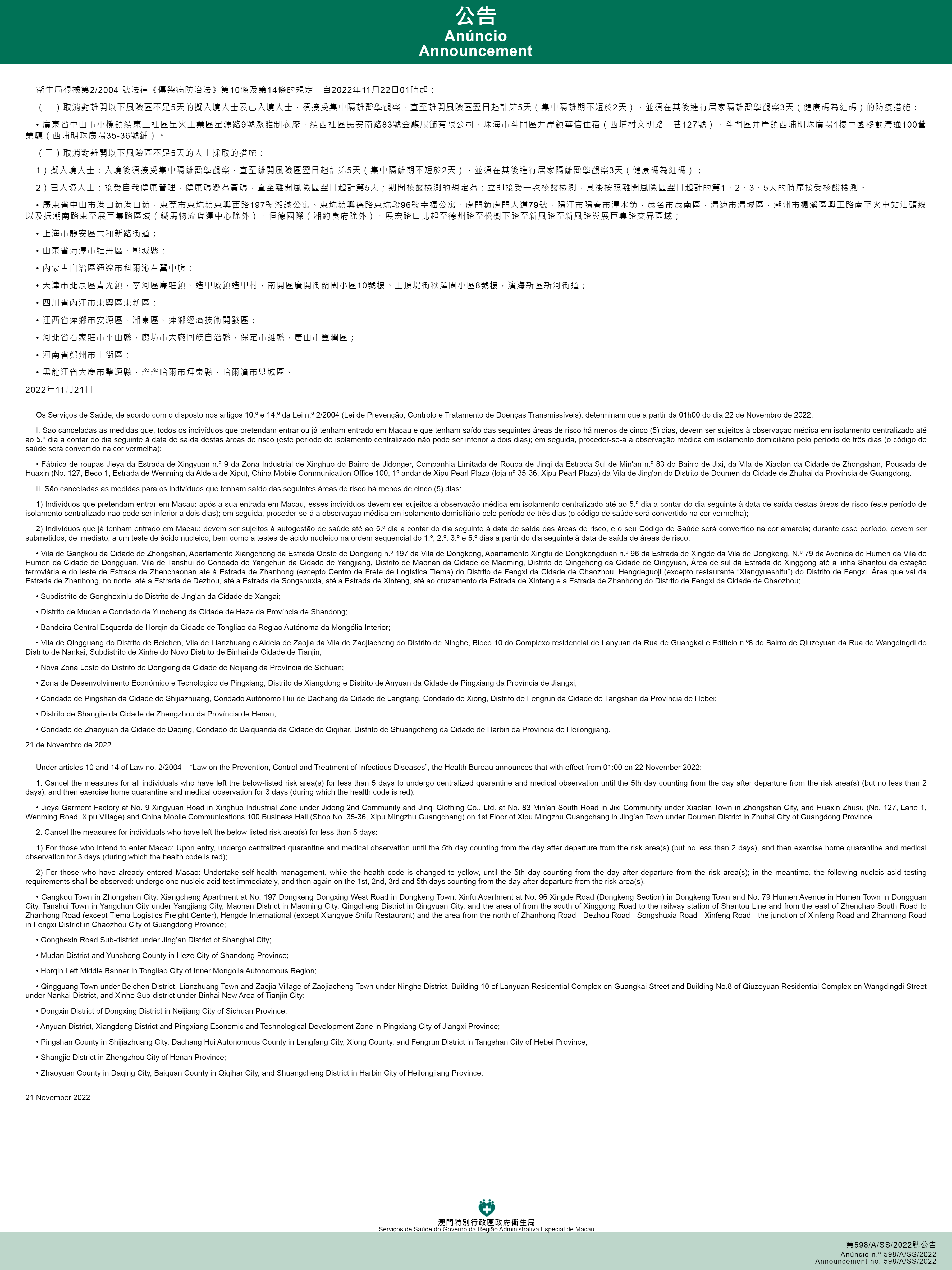 新型冠狀病毒感染應變協調中心(下稱應變協調中心)宣佈,因應內地的疫情變化,衛生局根據第2/2004號法律《傳染病防治法》第10條和第14條的規定,自2022年11月22日凌晨1時起,新增或取消對曾到內地相關區域人士的防疫措施: