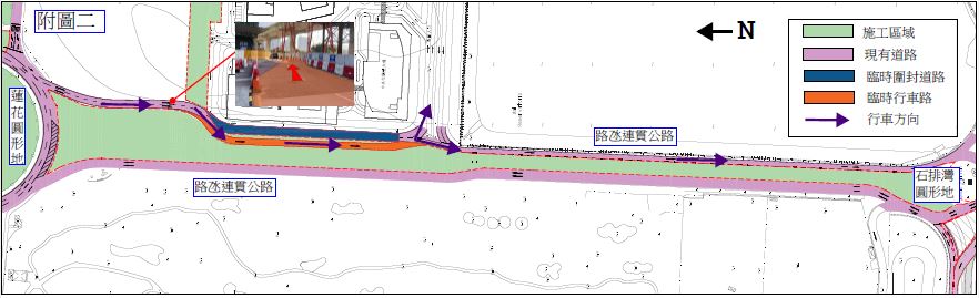 - 2022年12月11日開始至2023年1月12日期間,每日晚上10時至翌日早上6時,屆時將封閉現時介乎博愛大馬路與離島醫院大馬路之間一段路氹連貫公路的南行線部分路段,車輛可使用臨時行車線至石排灣圓形地方向。(詳見附圖二)。
