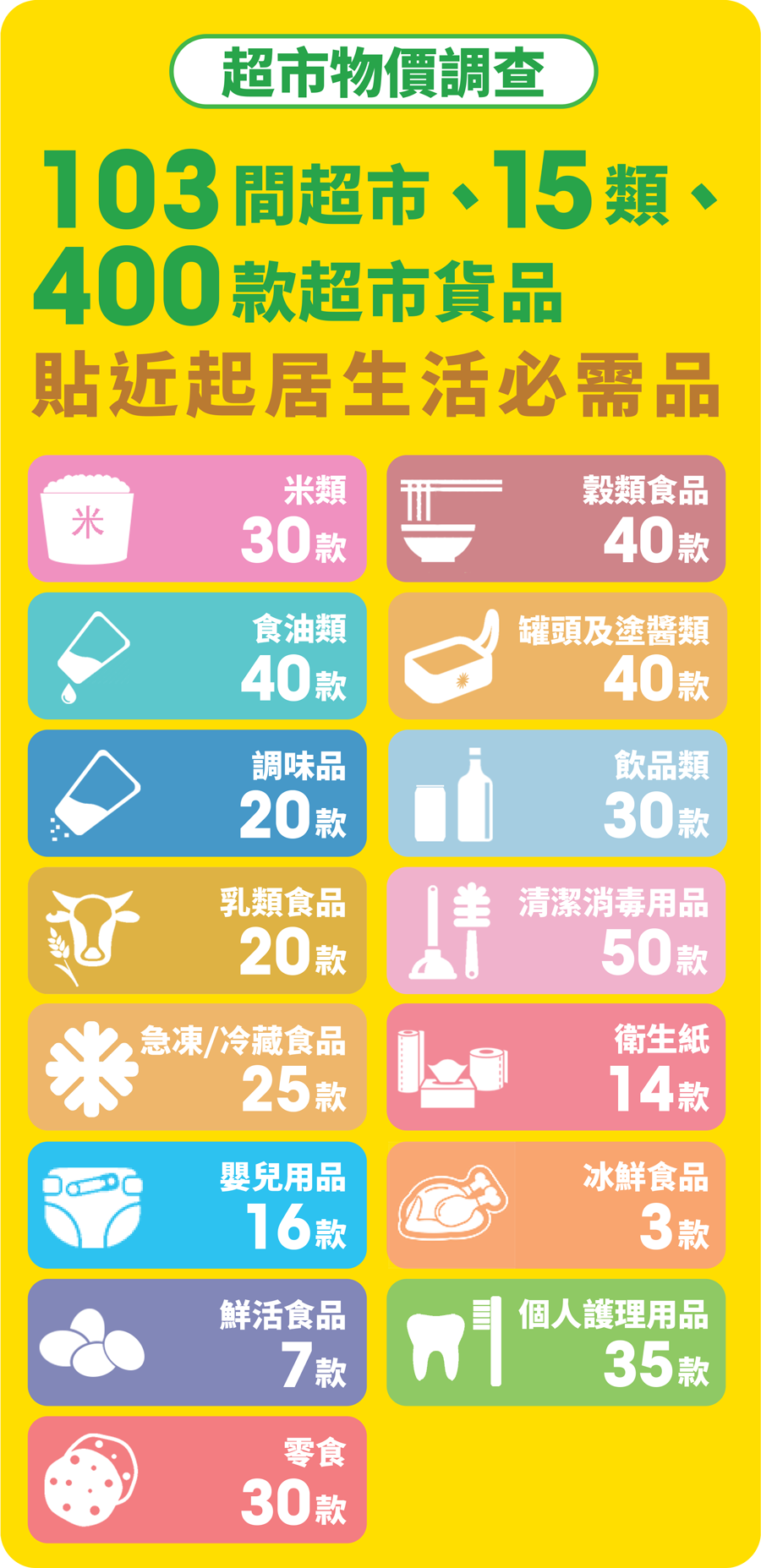 為加強物價透明度,消委會由今(2022)年初起先後多次增加調查超市與貨品的數量,現時調查超市的數量已增加至103間,貨品的種類及數量亦增加至15類及400款。