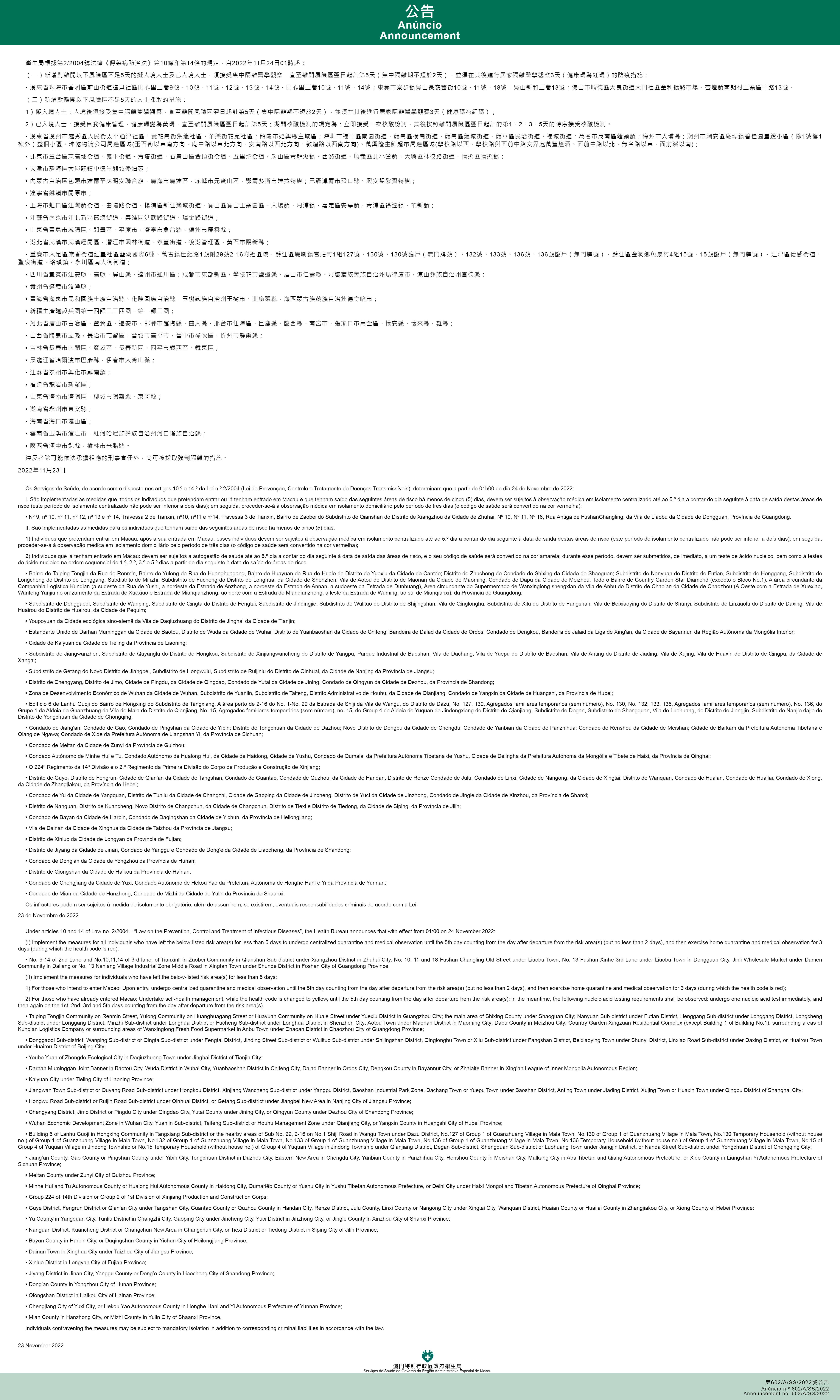 新型冠狀病毒感染應變協調中心(下稱應變協調中心)宣佈,因應內地的疫情變化,衛生局根據第2/2004號法律《傳染病防治法》第10條和第14條的規定,自2022年11月24日凌晨1時起,新增或取消對曾到內地相關區域人士的防疫措施: