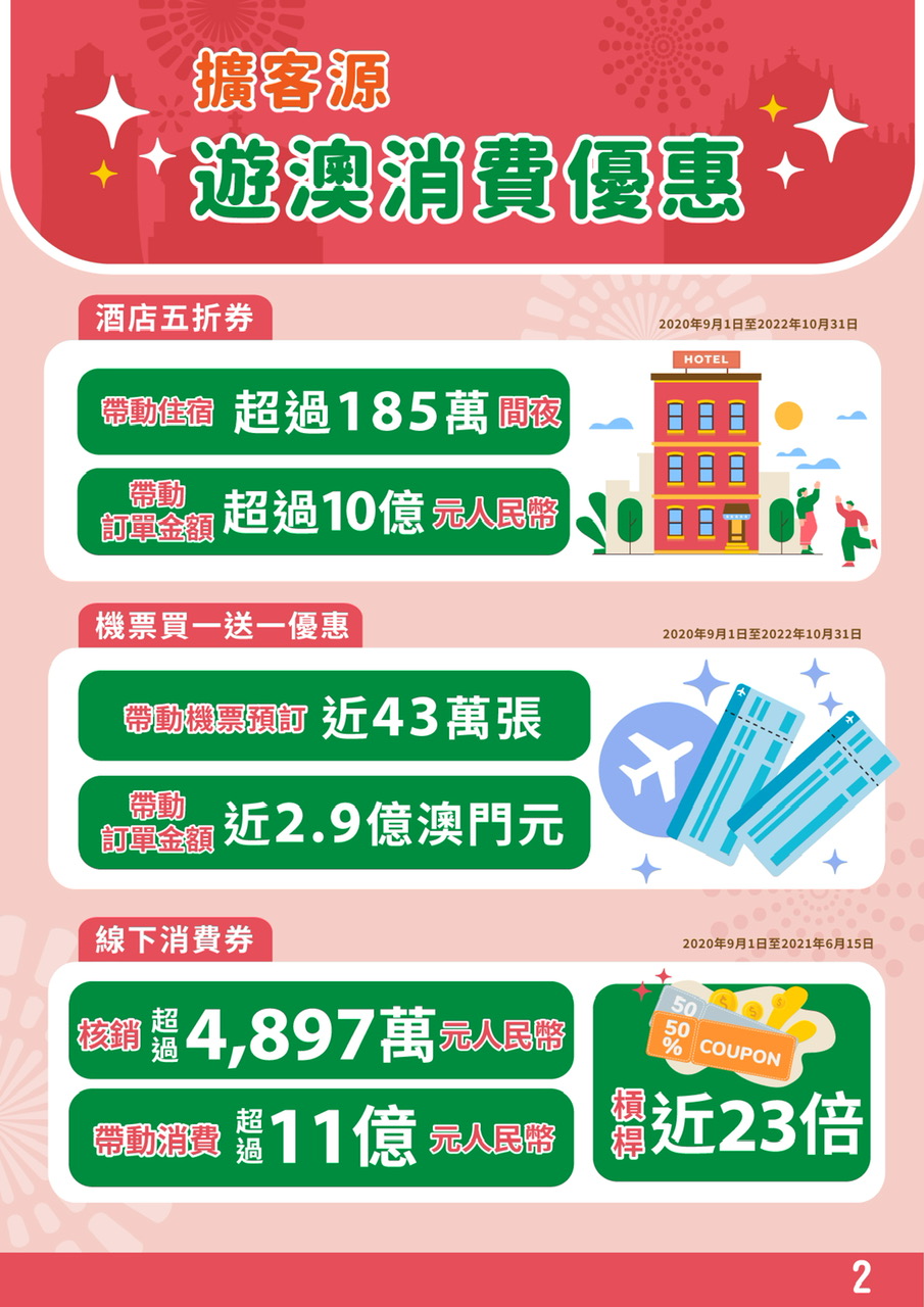旅遊局將持續全方位在各官方線上平台,包括微信、微博、抖音和小紅書等渠道,推出最新系列短視頻及貼文宣傳,並與航空公司、電商平台及線上旅行社加強合作,加推酒店五折券和機票“買一送一Plus”優惠,展示澳門優質旅遊產品,吸引旅客來澳旅遊,刺激旅遊消費,延長留澳時間。