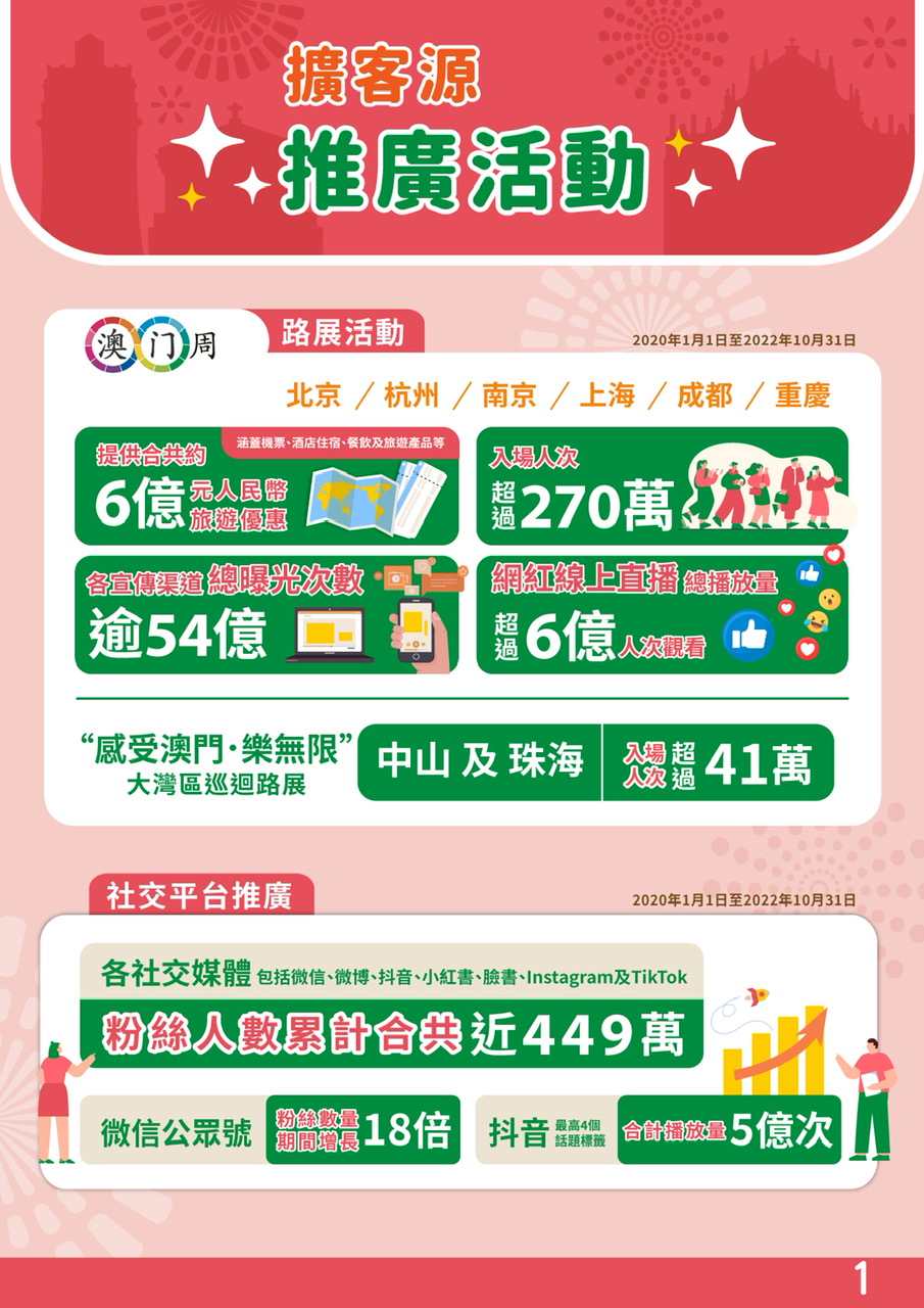 為配合澳門特別行政區政府擴客源的工作,旅遊局聯同多個單位合作,啟動系列宣傳“感受澳門樂無限”月月精彩活動,整合串聯特色活動和節慶,每月推出遊澳主題,展現澳門多項精彩旅遊元素,向旅客宣傳盛事之都的魅力,提振旅遊經濟,如本月主題“全城躍動”廣邀旅客體驗大賽車風馳電掣;12月主題“閃亮冬日”光影盛會點綴難忘遊澳時光。