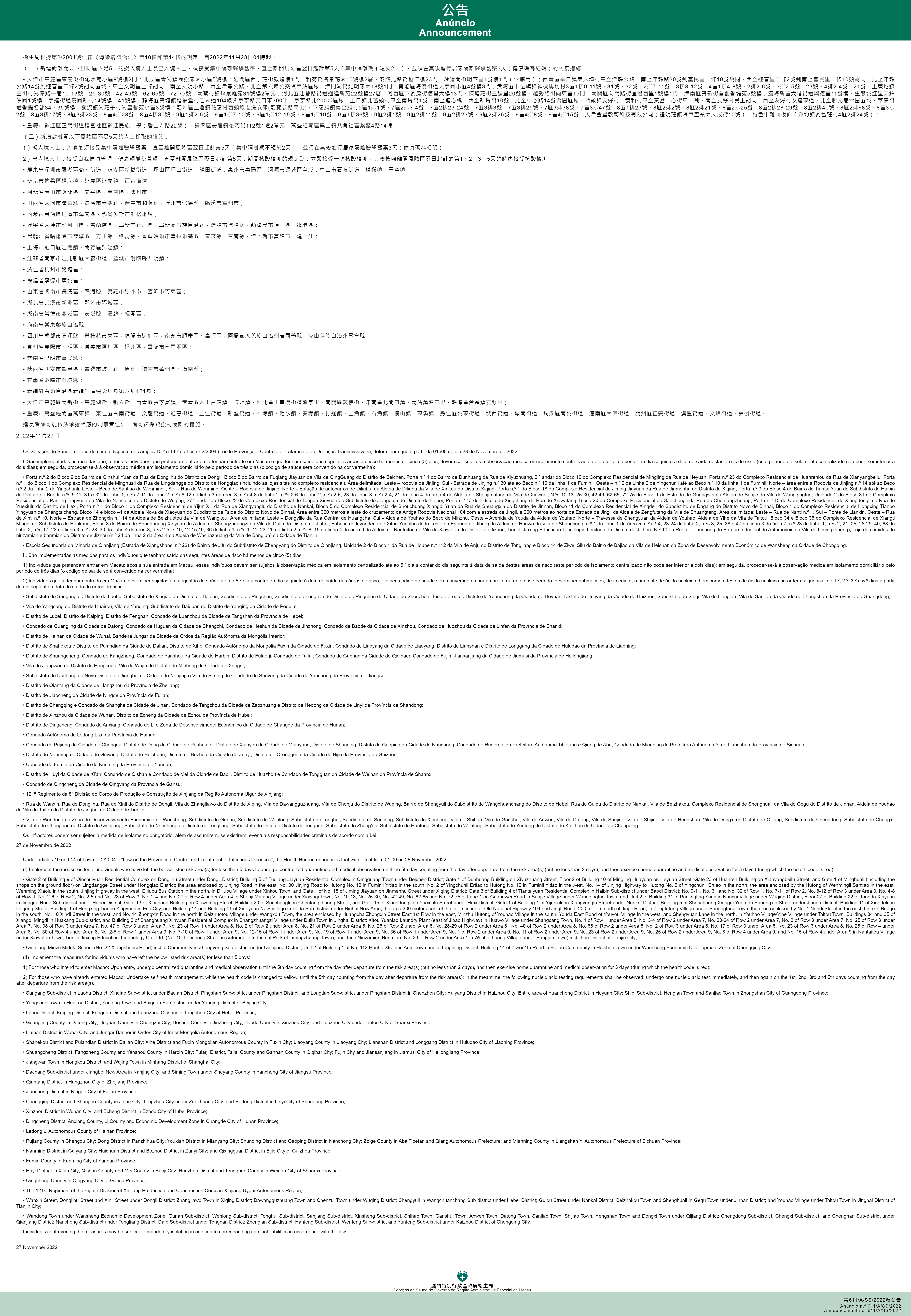 新型冠狀病毒感染應變協調中心(下稱應變協調中心)宣佈,因應內地的疫情變化,衛生局根據第2/2004號法律《傳染病防治法》第10條和第14條的規定,自2022年11月28日淩晨1時起,新增或取消對曾到內地相關區域人士的防疫措施: