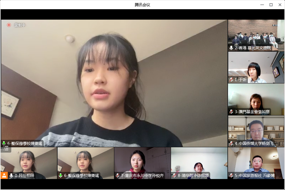 〝我的民俗相冊──內地與港澳青少年民俗攝影主題交流活動〞自2016年起組織青少年走進陝西、北京等地,開展包括民俗拍攝、參訪交流、攝影作品遴選及頒獎典禮等系列活動;以民俗文化為媒,搭建友誼橋樑。本年度分別組織北京清華大學附屬中學、香港慕光英文書院、重慶市永川中學和澳門聖保祿學校開展線上交流及4地線下活動:參與線上攝影培訓、中秋節線上互動,體驗國粹京劇及茶道文化、澳門學生參觀澳門藝術博物館石灣陶塑展取材、重慶學生組織參觀當地永川博物館等。其中重慶與澳門學生組成一對一結對夥伴,於活動期間交流兩地風俗、飲食及節慶文化,共同提交攝影作品,進行遴選。