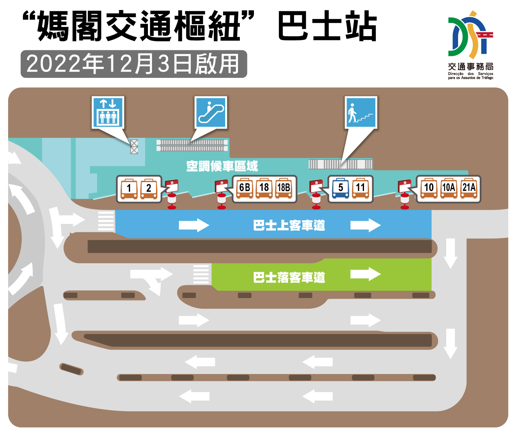 配合上述安排,12月3日首班車起,1、2、5、6B、10、10A、11、18、18B及21A巴士路線的發車總站調整至“媽閣交通樞紐”巴士站,站場採用上落客分流形式運作,場內可同時停靠約23台大巴;而現時的“媽閣總站”會保留為過路站並更名為“西灣湖景大馬路/媽閣碼頭”站,停靠路線不變。此外,同日(3日)首班車起,5路線取消停靠“旅遊塔/行車隧道”站及“澳門旅遊塔”站。