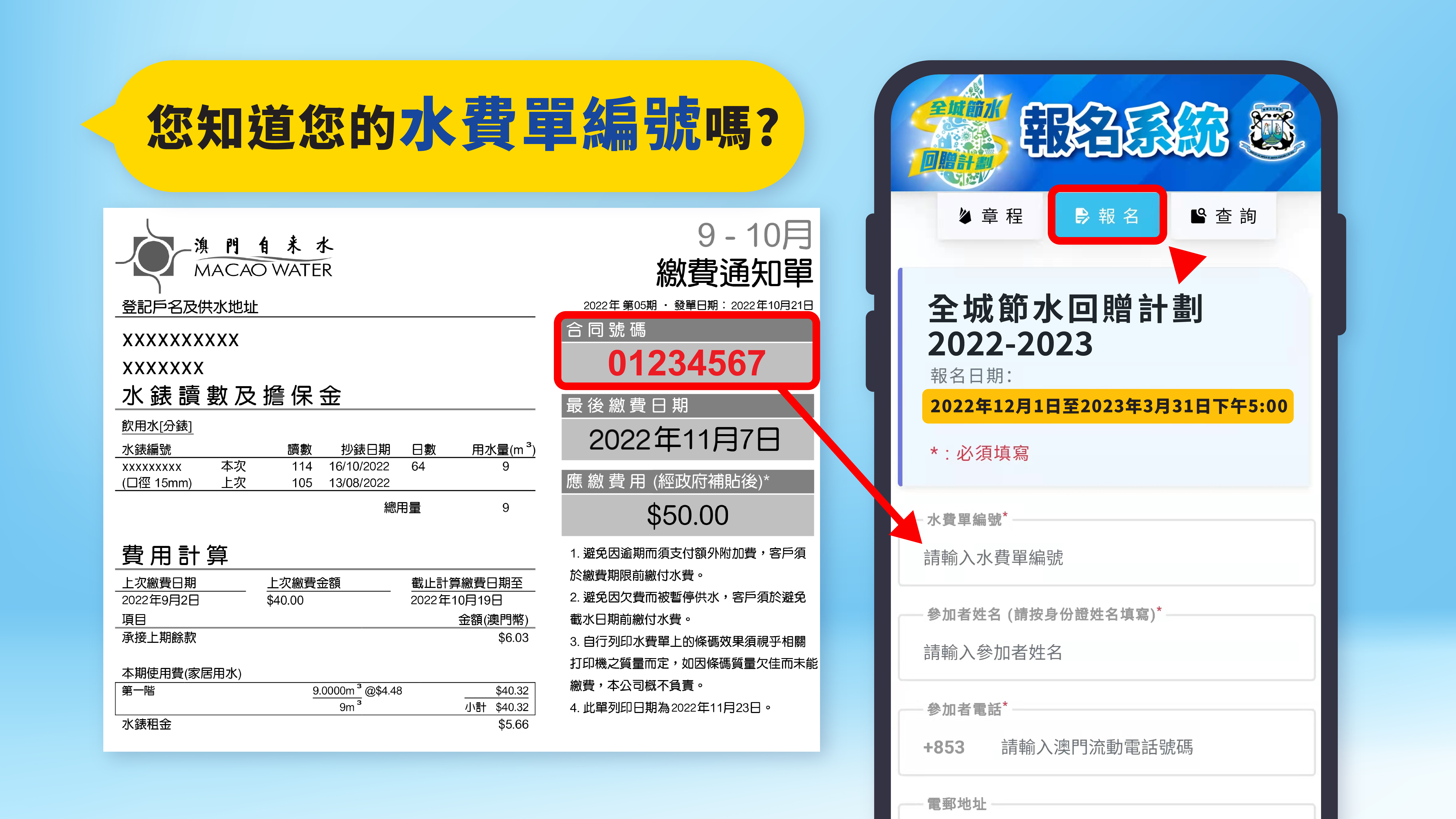 報名參加的首6,000戶,於2022年12月至2023年3月期間,用水量較去年同期節約5%至30%,即可獲得100元的水費回贈,同時自動參加抽獎,有機會獲得最多5,000元的超市禮券,抽獎獎品超過300份,報名期至2023年3月31日下午5時。