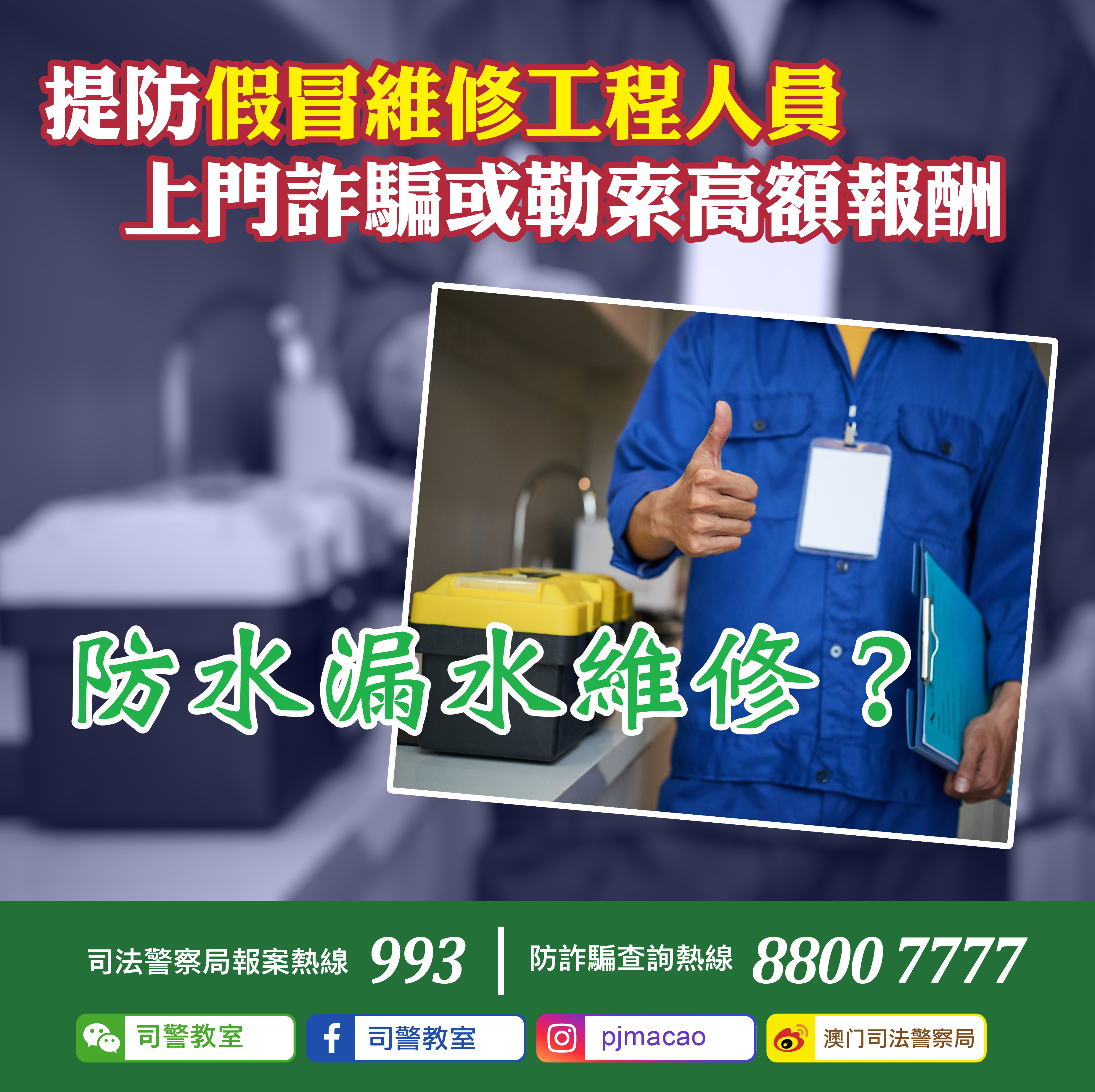 司警局近日接獲多名市民舉報,指有人於網絡社交平台冒認工程公司人員,聲稱提供家居滲漏水檢查及維修服務。多名事主遂邀約上門檢查,同意報價並進行維修,然而完工後被索取高於報價金額數倍的費用。在對方威迫之下,事主最終就範支付,並於事後報警求助。