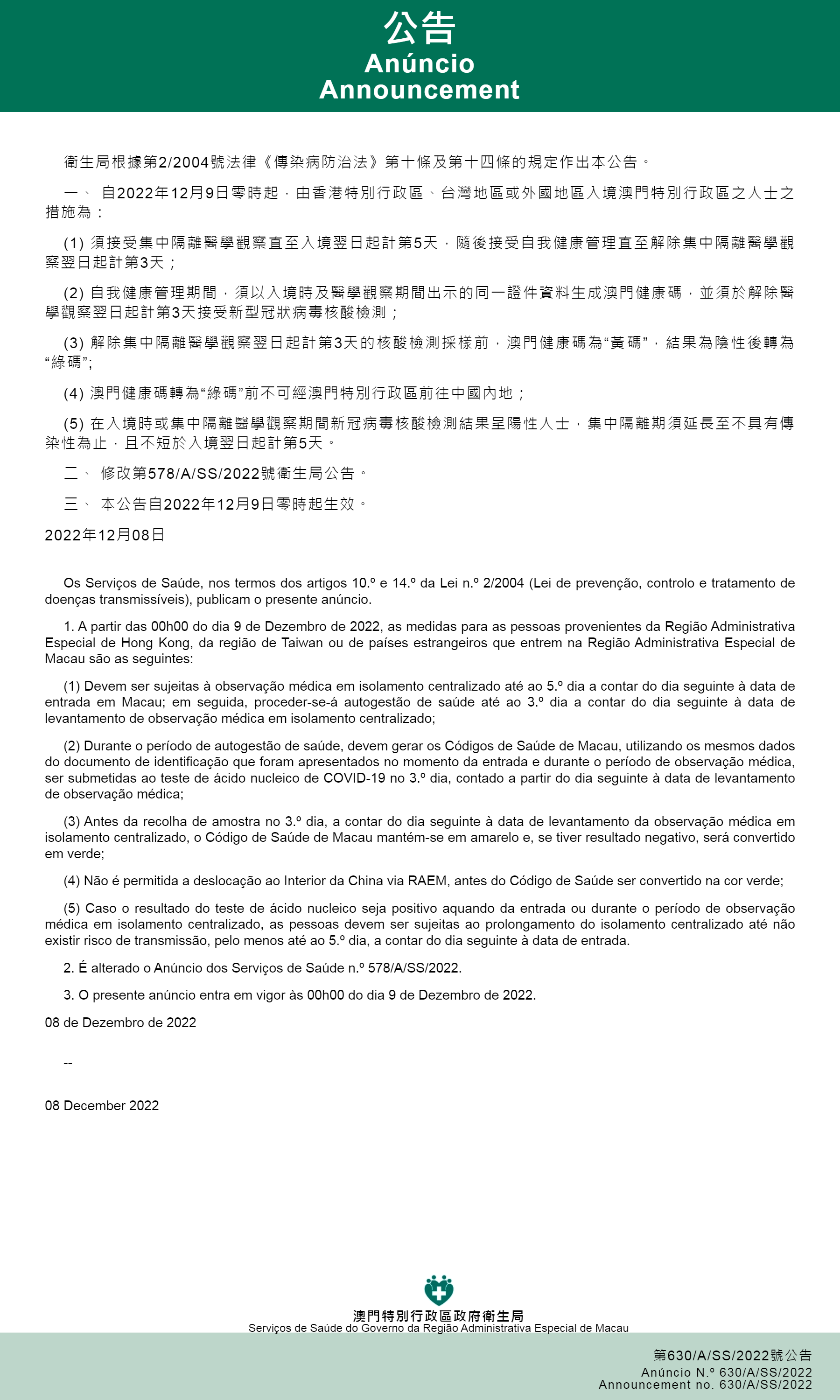 新型冠狀病毒感染應變協調中心(下稱應變協調中心)公佈,衛生局根據第2/2004號法律《傳染病防治法》第3條、第10條及第14條的規定作出第629/A/SS/2022號公告及第630A/SS/2022號公告,自2022年12月9日零時起,取消入境人士的落地核酸檢測、入境後的核酸檢測和快速抗原檢測措施。經調整後對入境人士的防疫措施如下: