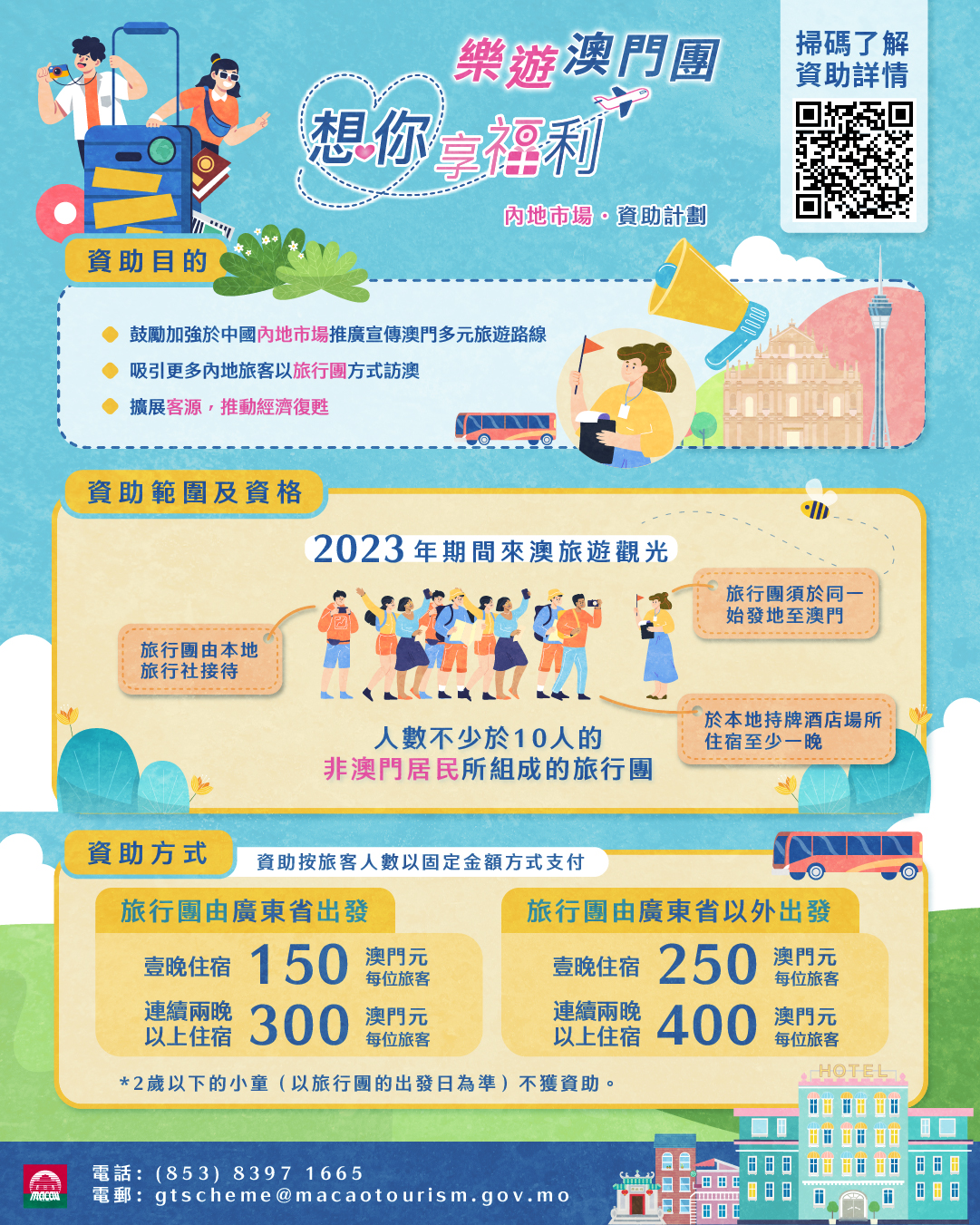 旅遊局推出《想你享福利.樂遊澳門團》資助計劃,鼓勵本地旅行社於2023年加強內地市場推廣宣傳澳門多元旅遊路線,吸引更多內地旅客以旅行團方式訪澳,達至擴展客源提振經濟復甦,並持續推動優質旅遊發展。計劃即日起接受本地旅行社報名。
