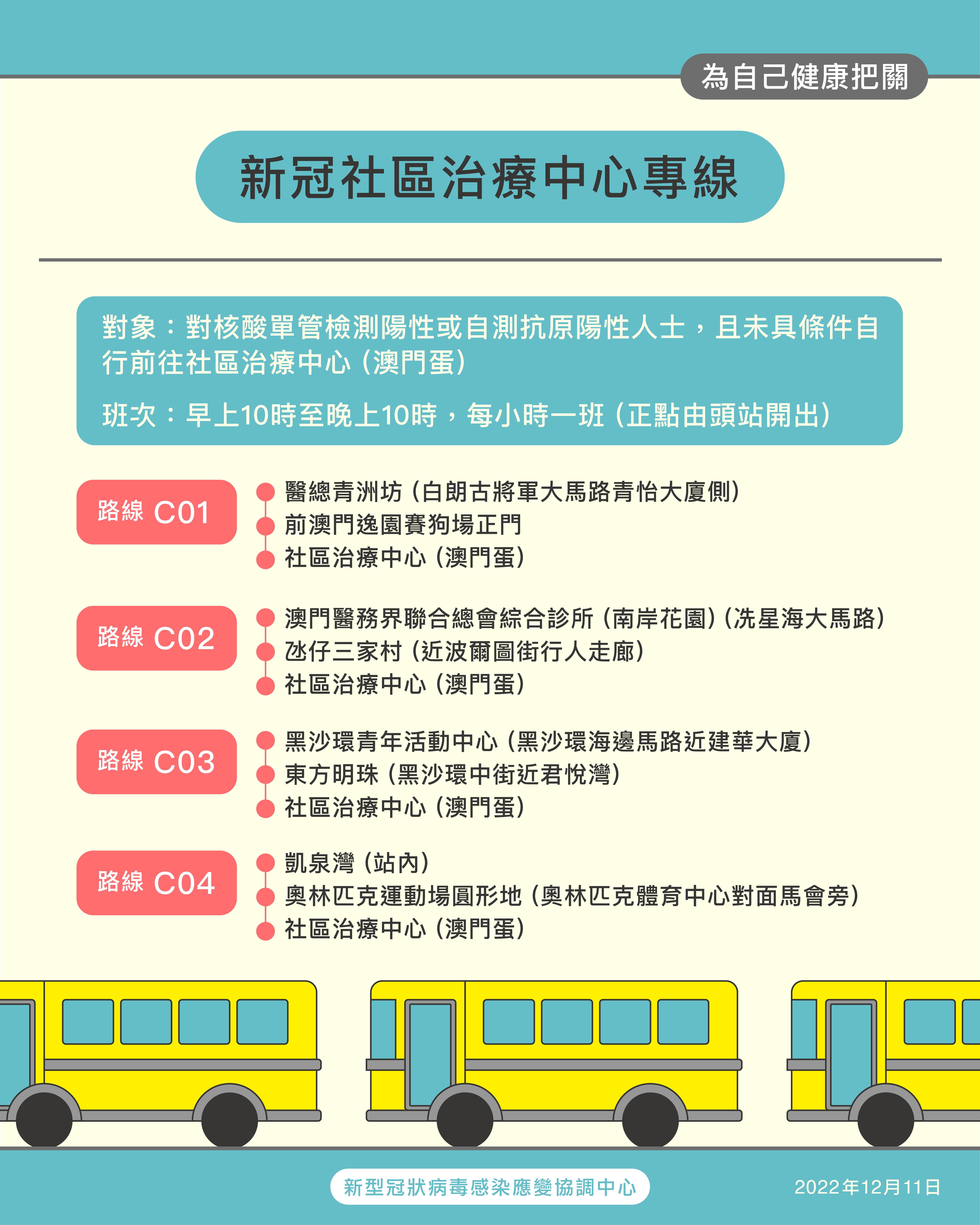 新型冠狀病毒感染應變協調中心表示,為方便新冠感染者前往社區治療中心(澳門蛋)就診,將於明後兩天(12月12日及13日)安排8個接載點的巴士專線,乘坐對象為對核酸單管檢測陽性或自測抗原陽性人士,且未具條件自行前往社區治療中心(澳門蛋)。其後將於周三(12月14日)增設更多接載點接送新冠感染者到各社區門診就診。