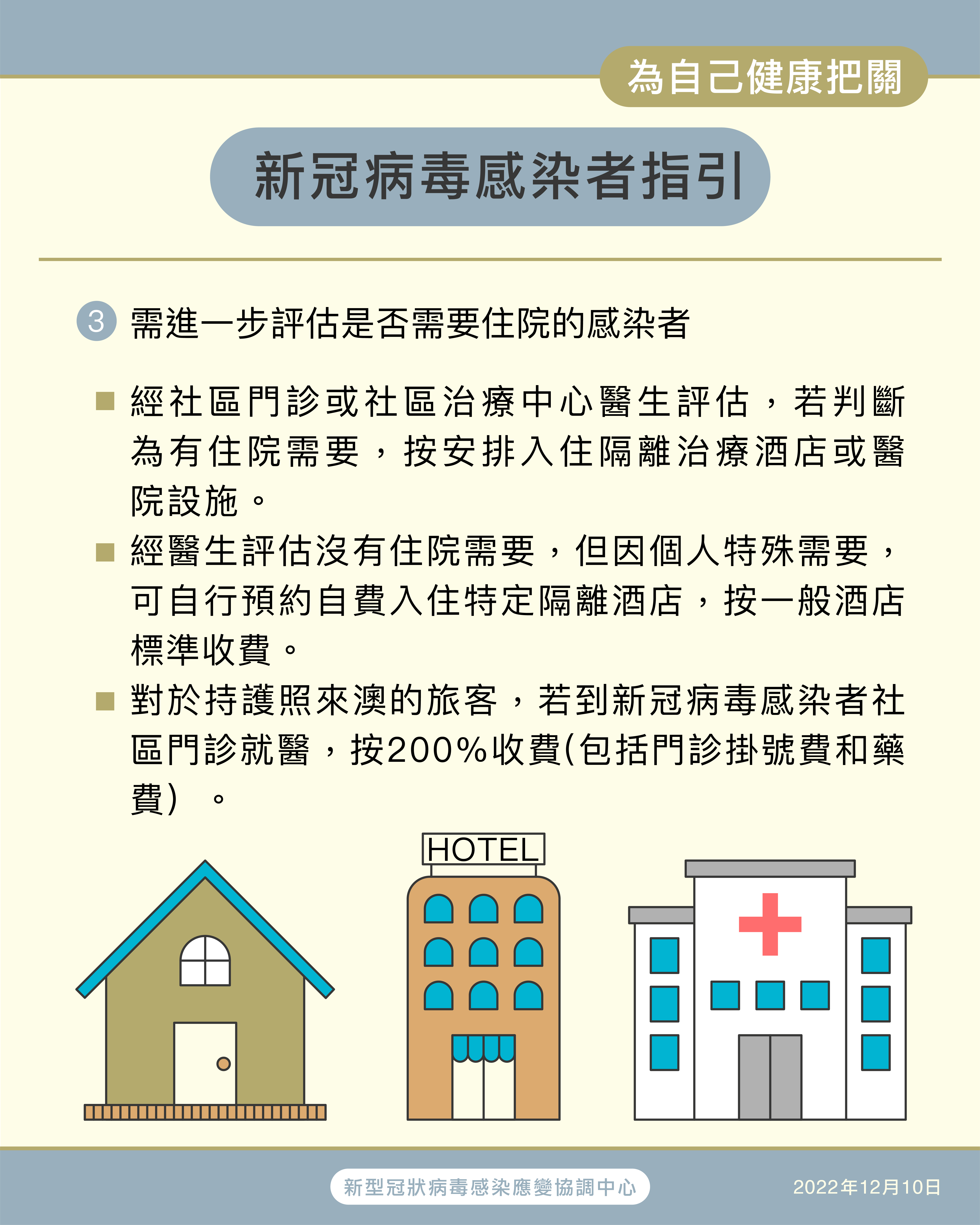 有醫療需要的感染者,經社區門診或社區治療中心醫生評估,若判斷為有住院需要,可獲安排入住隔離治療酒店或醫院設施。隔離治療酒店按醫院住院標準收費;經醫生評估沒有住院需要,取藥後可離開,但因個人特殊需要,可自行預約自費入住特定隔離酒店,按一般酒店標準收費。此外,對於持護照來澳的旅客,若到新冠病毒感染者社區門診就醫,按200%收費(包括門診掛號費和藥費)。