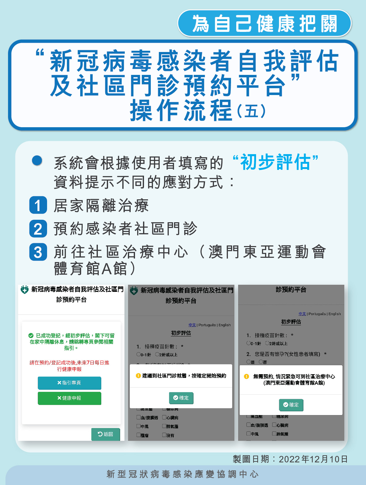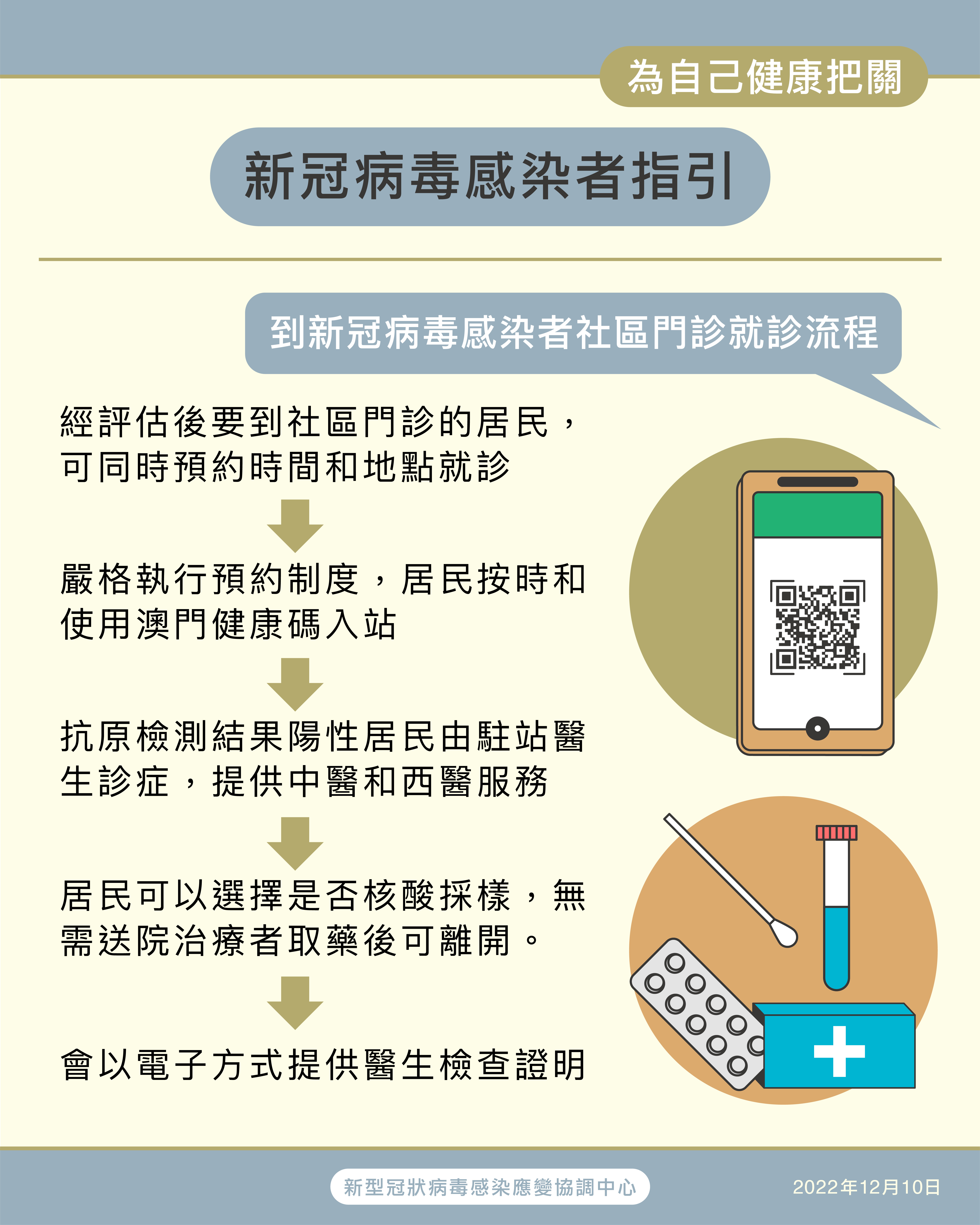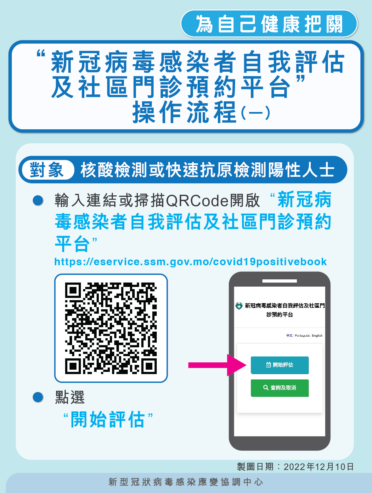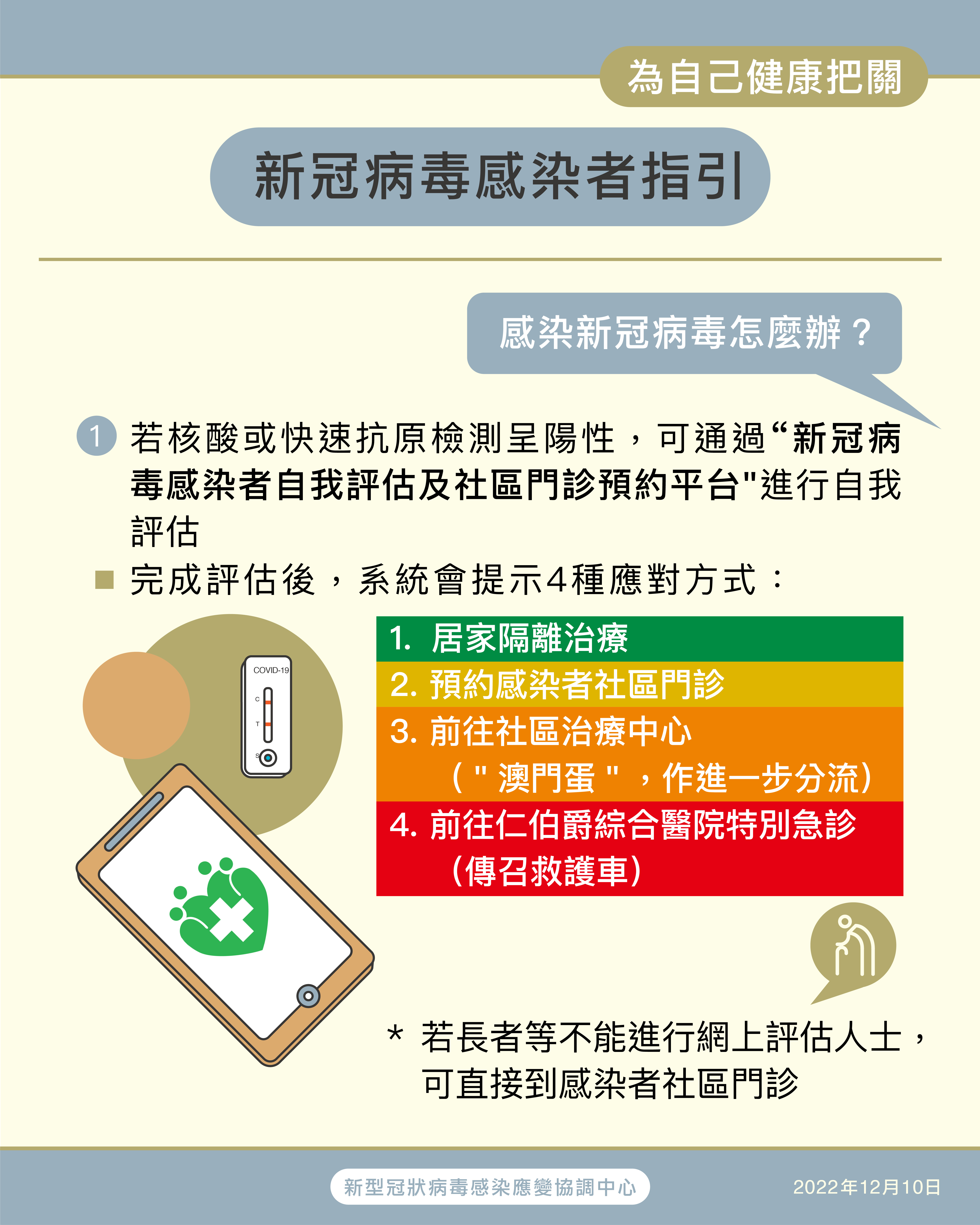 居民若為核酸檢測陽性或快速抗原檢測發現陽性反應時,須先通過“新冠病毒感染者自我評估及社區門診預約平台”(https://eservice.ssm.gov.mo/covid19positivebook)(12月14日開通)進行自我評估(具體操作可參閱附件【圖文包一】),經評估後可按指引進行居家隔離、預約到“新冠病毒感染者社區門診”(下稱社區門診)或前往社區治療中心(澳門東亞運動會體育館A館)(具體可參閱附件【圖文包二】);若感染者當時處於危急情況,應立即致電999求助。