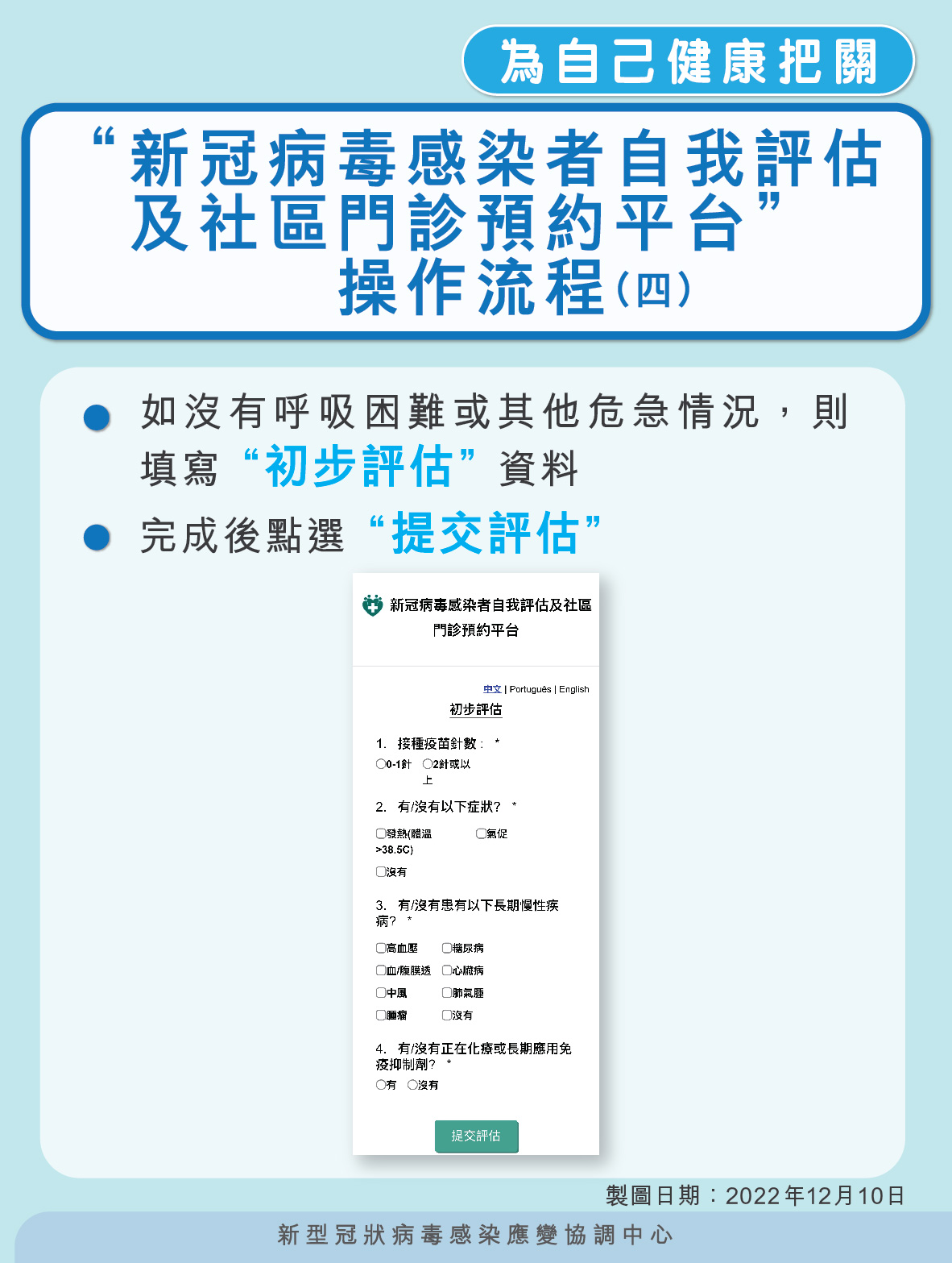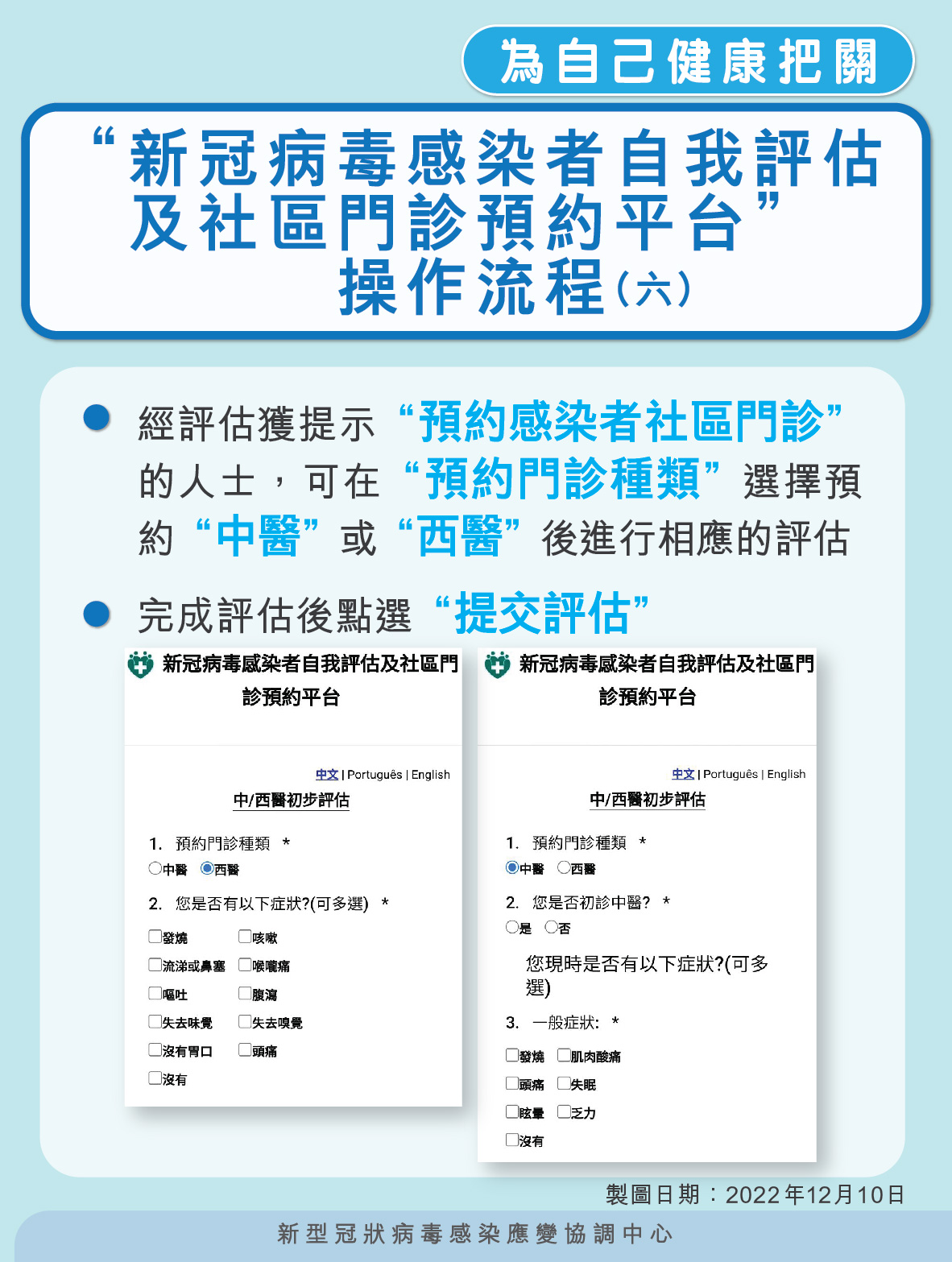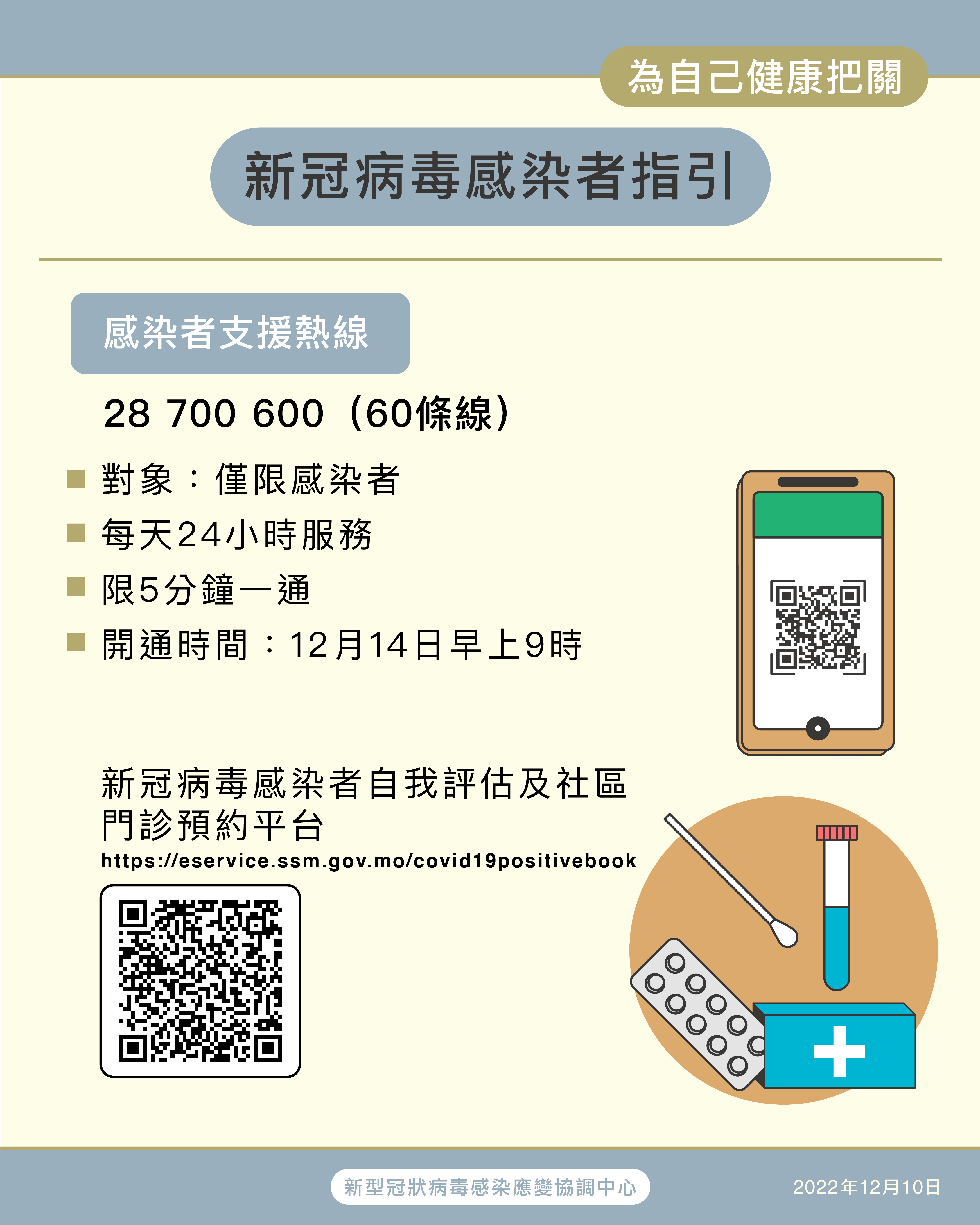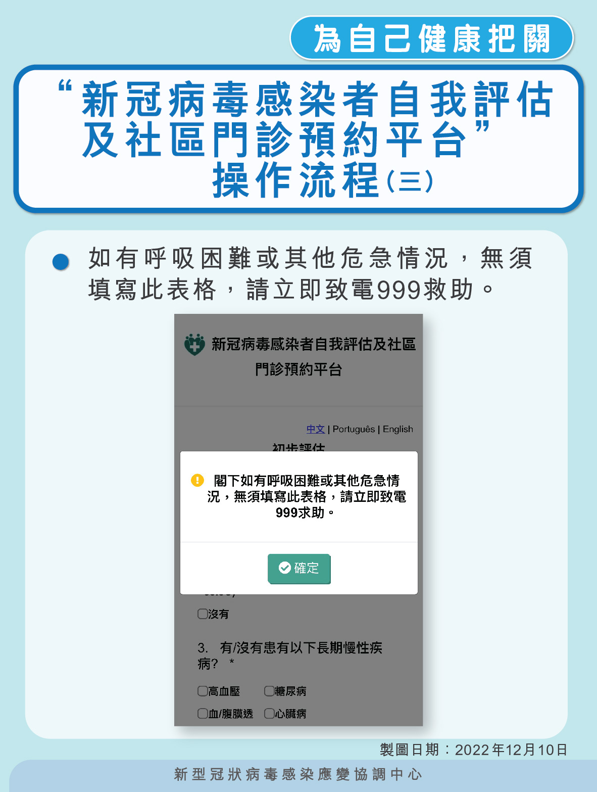 居民若為核酸檢測陽性或快速抗原檢測發現陽性反應時,須先通過“新冠病毒感染者自我評估及社區門診預約平台”(https://eservice.ssm.gov.mo/covid19positivebook)(12月14日開通)進行自我評估(具體操作可參閱附件【圖文包一】),經評估後可按指引進行居家隔離、預約到“新冠病毒感染者社區門診”(下稱社區門診)或前往社區治療中心(澳門東亞運動會體育館A館)(具體可參閱附件【圖文包二】);若感染者當時處於危急情況,應立即致電999求助。