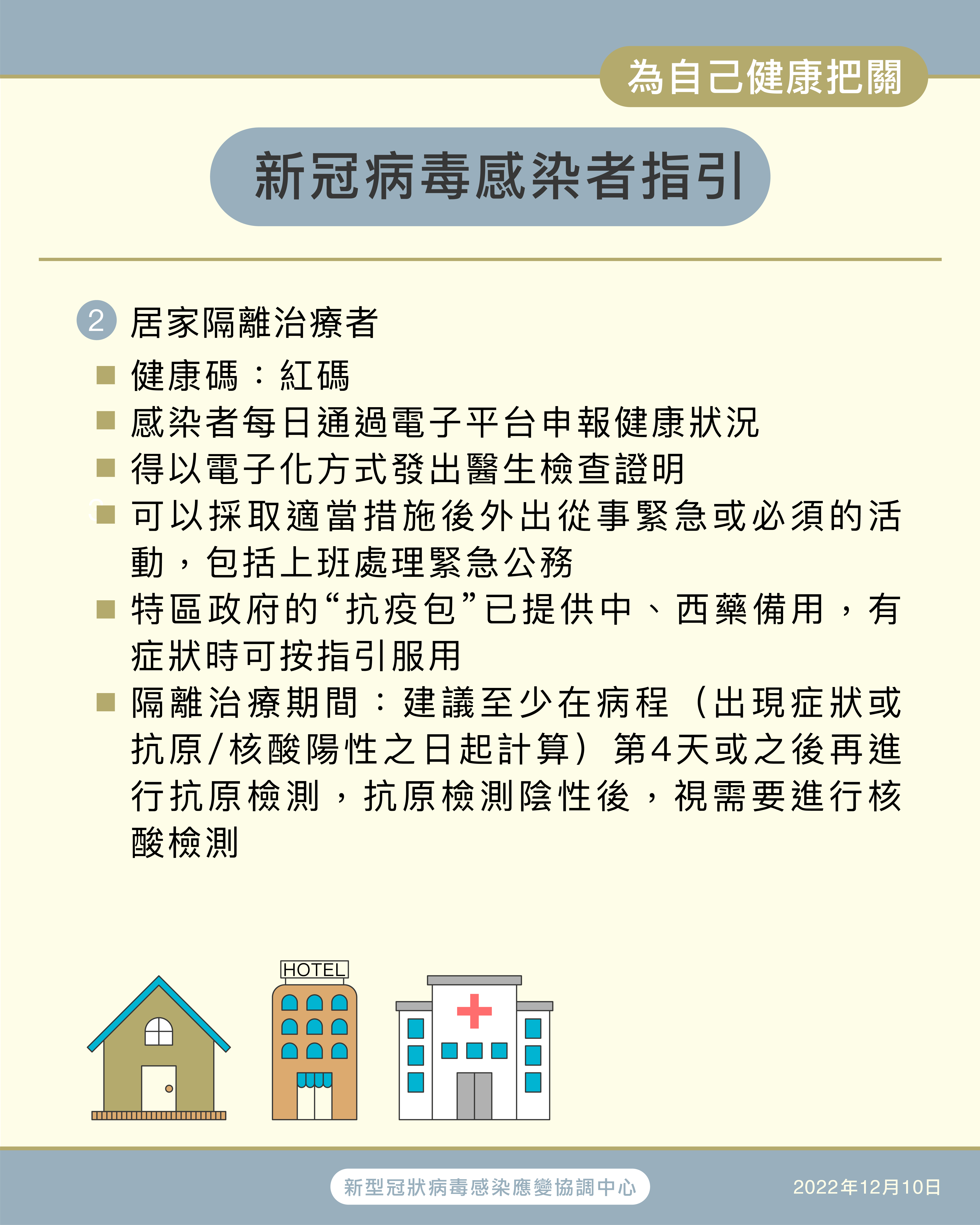 有醫療需要的感染者,經社區門診或社區治療中心醫生評估,若判斷為有住院需要,可獲安排入住隔離治療酒店或醫院設施。隔離治療酒店按醫院住院標準收費;經醫生評估沒有住院需要,取藥後可離開,但因個人特殊需要,可自行預約自費入住特定隔離酒店,按一般酒店標準收費。此外,對於持護照來澳的旅客,若到新冠病毒感染者社區門診就醫,按200%收費(包括門診掛號費和藥費)。