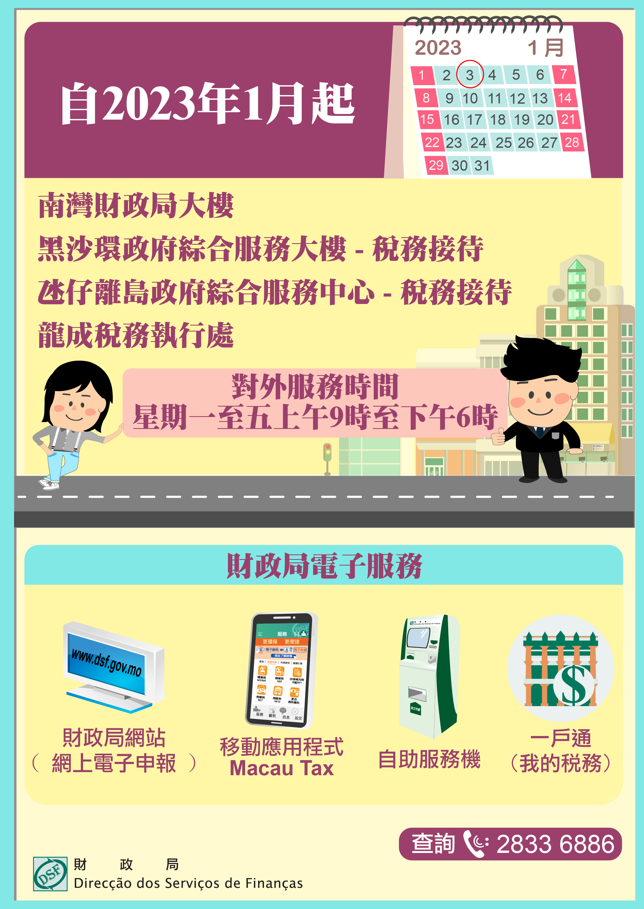 自2023年1月起,位於南灣大馬路的財政局大樓以及龍成稅務執行處之對外服務時間將與其他兩個辦公地點(黑沙環政府綜合服務大樓及離島政府綜合服務中心之稅務接待)一致,為星期一至五上午9時至下午6時,敬請公眾留意。