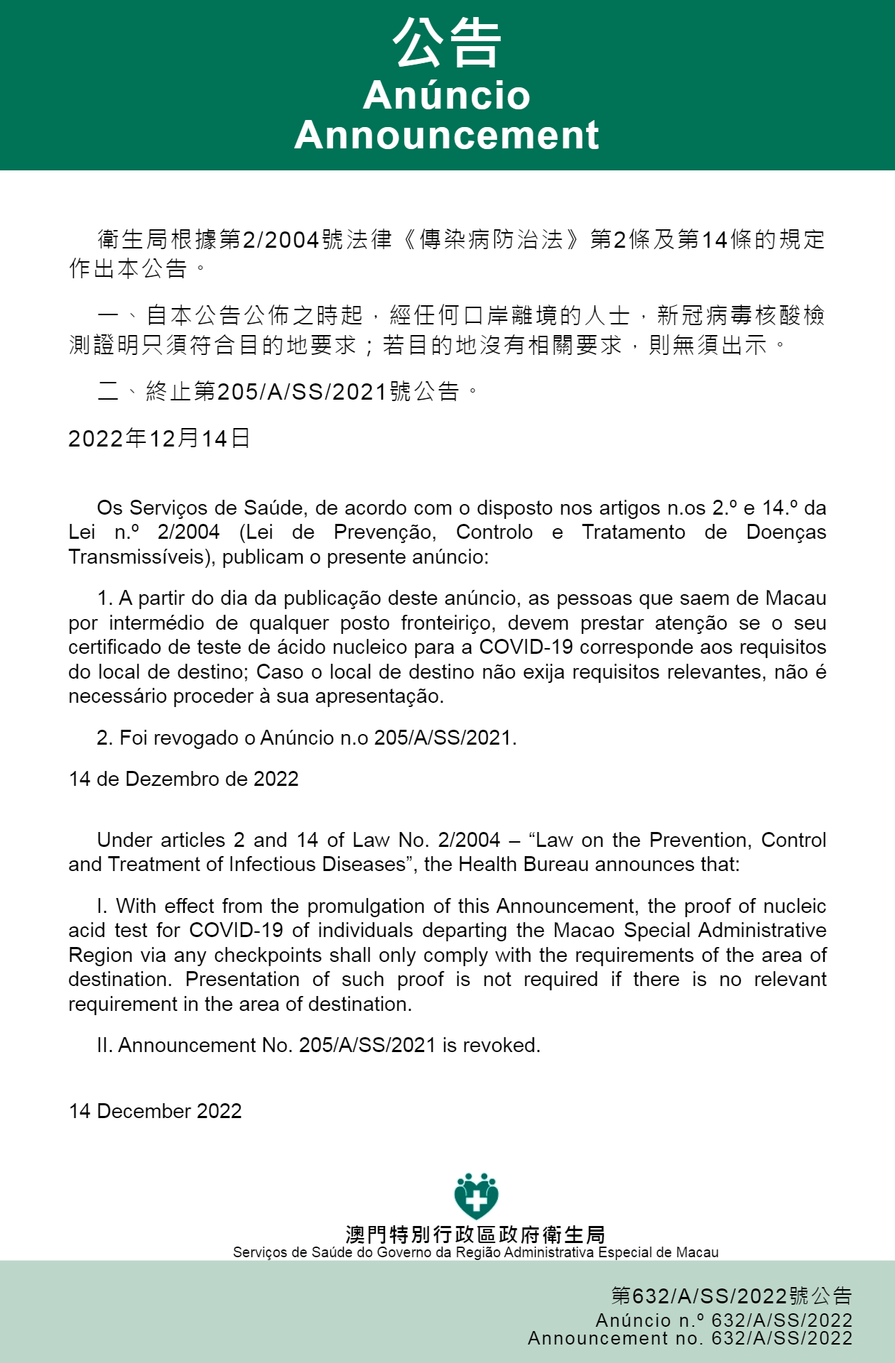 新型冠狀病毒感染應變協調中心(下稱應變協調中心)公佈,衛生局根據第 2/2004 號法律《傳染病防治法》 第 2 條及第 14 條的規定,作出第632/A/SS/2022號公告,自今(14)日起,經任何口岸離境的人士,新冠病毒核酸檢測證明只須符合目的地要求;若目的地沒有相關要求,則無須出示;並呼籲居民出行前留意及配合目的地的核酸檢測證明要求。