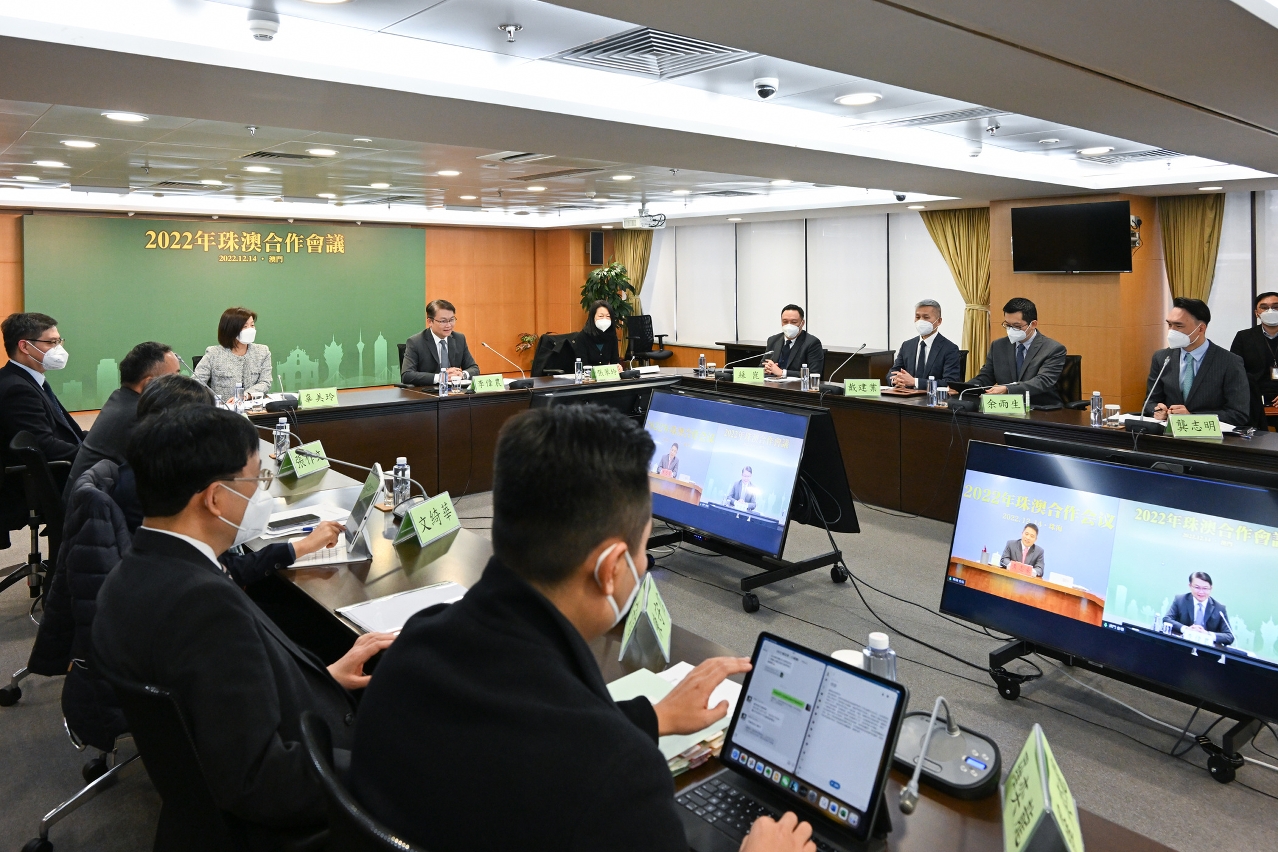 12月14日下午,2022年珠澳合作會議以視頻連線方式在珠海、澳門兩地召開,深入貫徹落實二十大精神,圍繞“全力支持服務橫琴粵澳深度合作區建設、促進珠澳合作高品質發展”的主題,共同謀劃推進珠澳各領域合作向高水平邁進。珠海市委副書記、市長黃志豪,澳門特區政府經濟財政司司長李偉農共同主持會議並作發言。中央政府駐澳門聯絡辦經濟部、橫琴粵澳深度合作區、拱北海關、珠海邊檢總站、珠海海事局等單位代表作為特邀嘉賓出席會議。