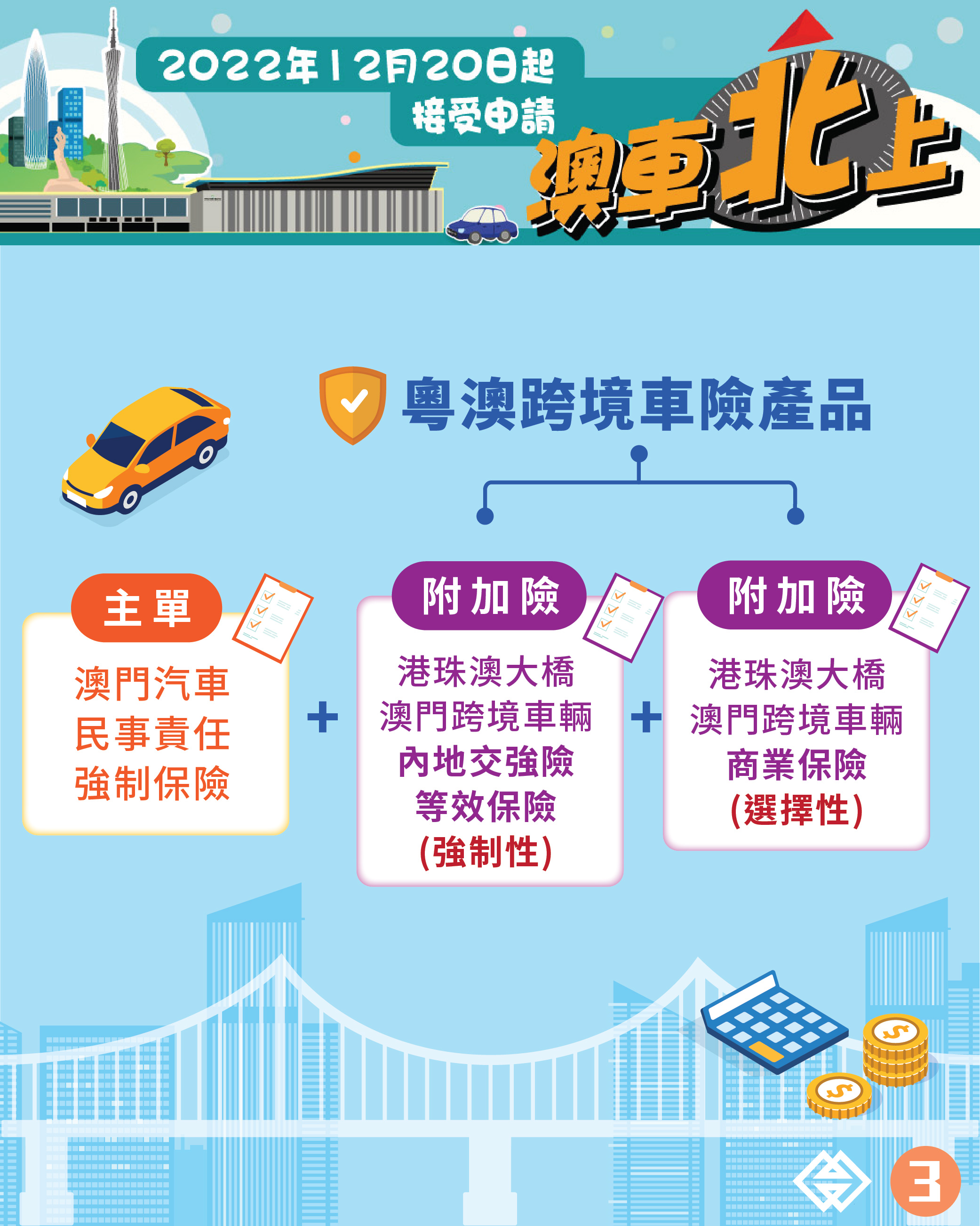 車主透過“澳車北上”信息管理服務系統作出申請的過程中,將收到短訊、電郵及系統通知,提醒上載粵澳跨境車險資料,以繼續申請流程。申請資格及手續詳情,可瀏覽交通事務局澳車北上專題網頁(https://www.dsat.gov.mo/mcars-to-gd)。