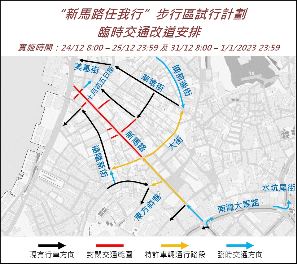 配合文化局於12月24日、25日、31日及明年1月1日舉辦的“新馬路任我行”步行區試行計劃,12月24日上午8時至25日晚上11時59分,以及12月31日上午8時至2023年1月1日晚上11時59分,介乎巴素打爾古街與龍嵩正街之間的一段新馬路(亞美打利庇盧大馬路)及周邊部份道路實施封閉交通,部份路段則設為允許特許車輛通行路段,以方便公共及緊急服務車輛維持服務(詳見附表)。而為保障車輛進出新馬路東西兩則道路,快艇頭街、果欄街、關前後街及介乎新填巷與紅窗門街之間一段福隆新街將實施反方向行車。