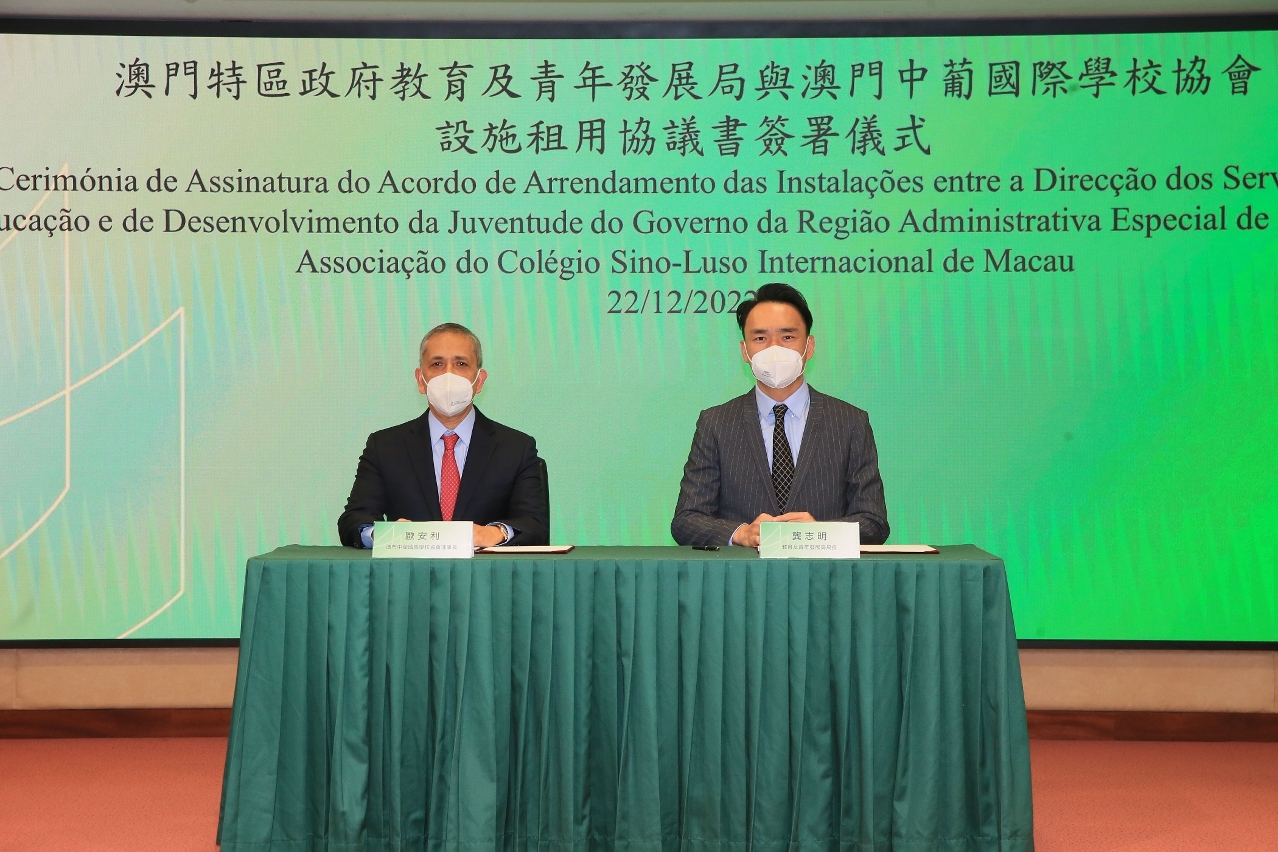 根據第100/2022 號社會文化司司長批示授予之權力, 2022年12月22日,澳門中葡國際學校協會設施租用協議書的簽署儀式在教育及青年發展局舉行,由教青局局長龔志明代表特區政府與澳門中葡國際學校協會代表歐安利簽署相關協議。