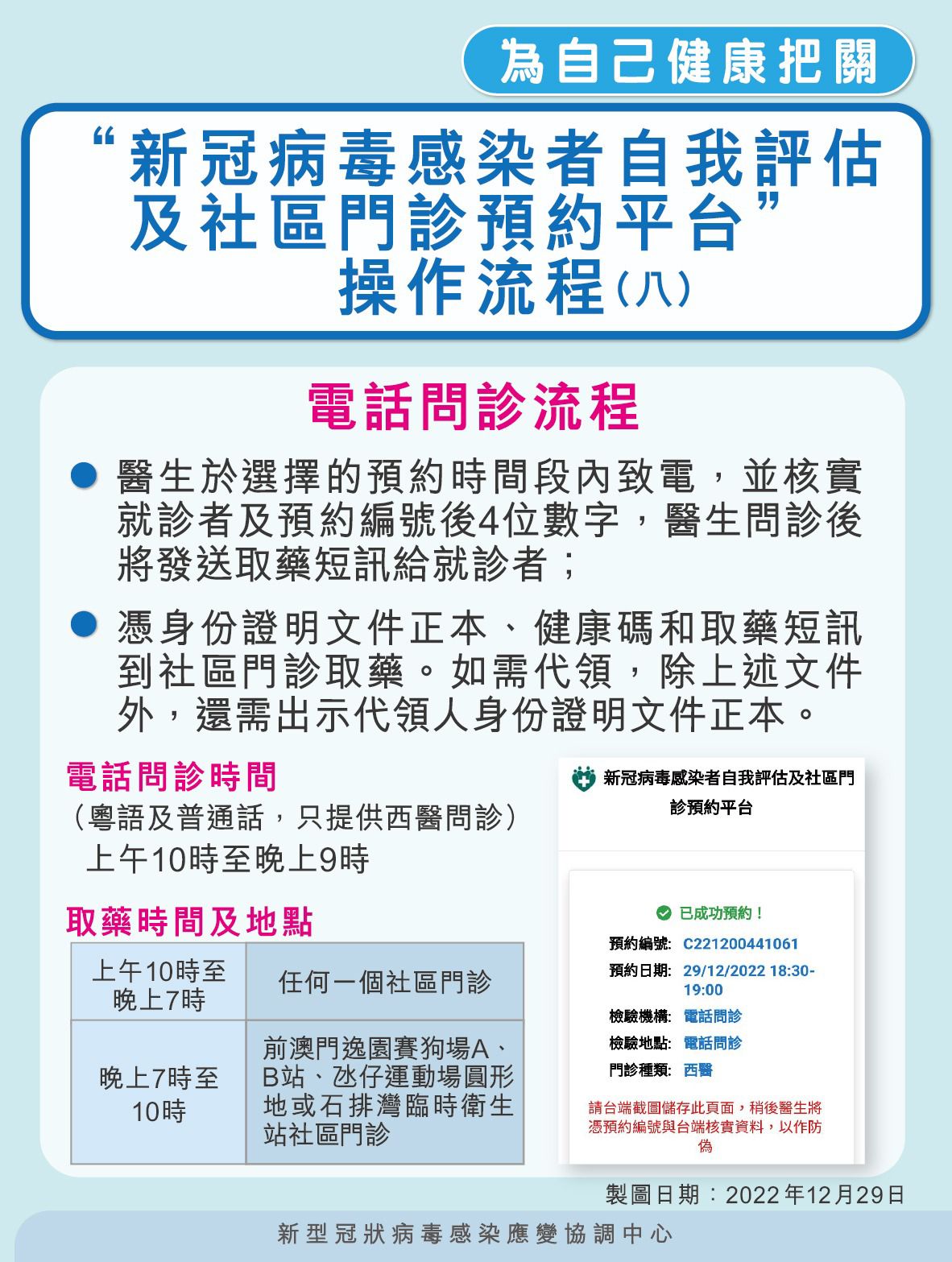 為進一步便利不同治療需要的輕症感染者在晚間到醫院求診的需求,應變協調中心將於明日(12月31日)起,將優化社區門診的服務,於自我評估平台加設社區門診西醫電話問診選項服務,電話問診時間為︰早上10時至晚上9時,流程如下(具體可參閱附件【圖文包】):