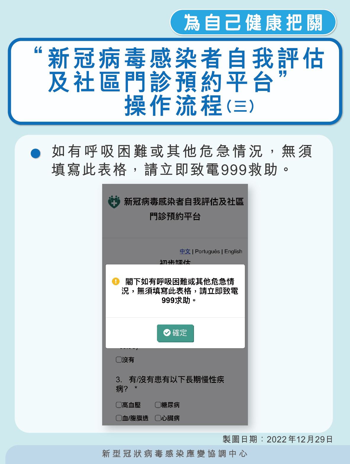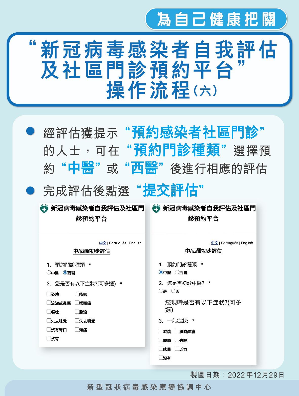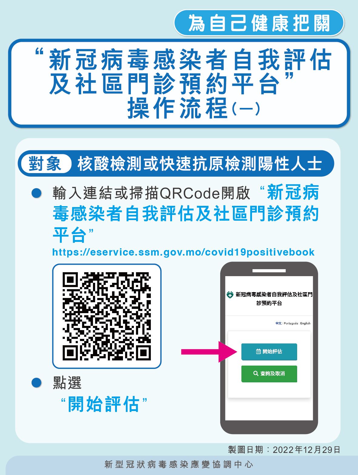 1. 核酸檢測或快速抗原檢測呈陽性的居民通過自我評估平台(https://eservice.ssm.gov.mo/covid19positivebook)進行自我評估;