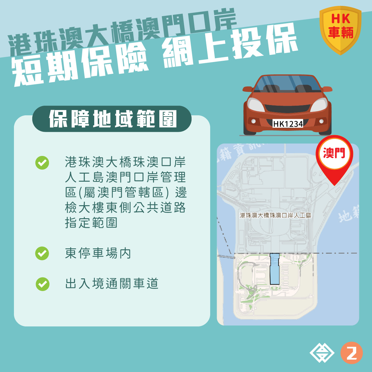 香港車輛根據《港珠澳大橋邊檢大樓東停車場的使用及經營規章》,入出港珠澳大橋珠澳口岸人工島澳門口岸管理區邊檢大樓東側公共道路、停車場,以及出入境通關車道的指定範圍,可透過購買短期保險獲得對第三人造成損失或損害所負的民事責任保險保障。
