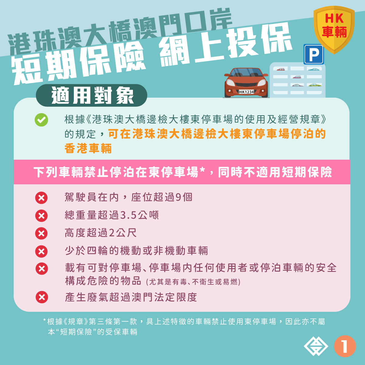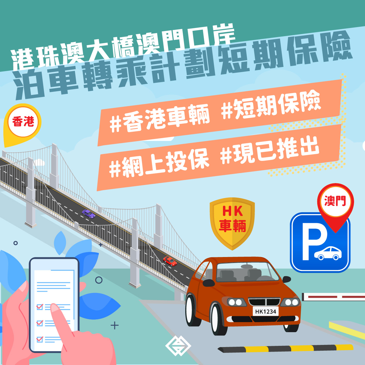 為便利香港旅客自駕來澳,澳門金融管理局協調澳門保險業界推出“港珠澳大橋澳門口岸泊車轉乘計劃短期保險”(下稱“短期保險”),讓香港車主可透過網上平台購買短期保險後,將車輛停泊於港珠澳大橋澳門口岸東停車場。