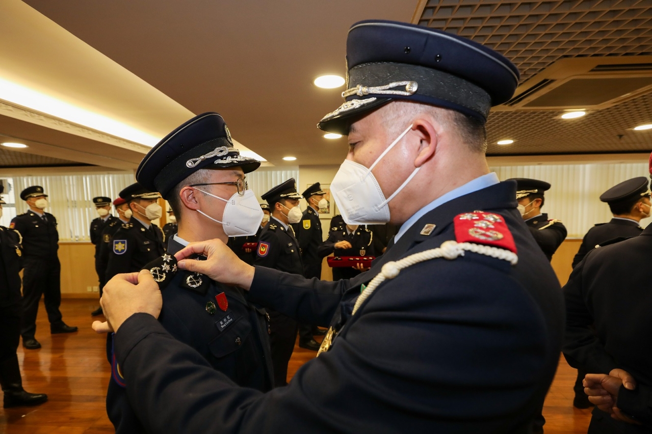 吳錦華局長在儀式上祝賀獲晉升的警官,並對他們過往的工作表現予以肯定;同時勉勵他們應牢記初心及使命,忠於國家,守護澳門,在崗位上充分發揮自己的才能,與同事同心協力,繼續以專業精幹的工作態度服務市民,為國家和特區政府的繁榮穩定保駕護航。