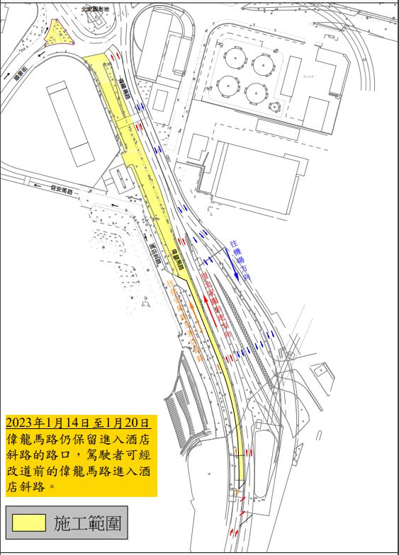 由1月14日至1月20日,偉龍馬路仍保留進入酒店斜路的路口,駕駛者可經改道前的偉龍馬路進入酒店斜路(詳見附圖1);