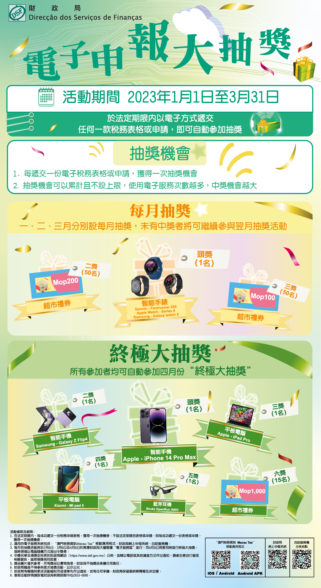 因應第一季報稅高峰期,為鼓勵納稅人利用手機及或網上報稅,財政局特別推出電子申報抽奬活動,凡在2023年1月1日至3月31日期間透過電子方式進行報稅或遞交稅務申請者,即可自動參加抽奬。