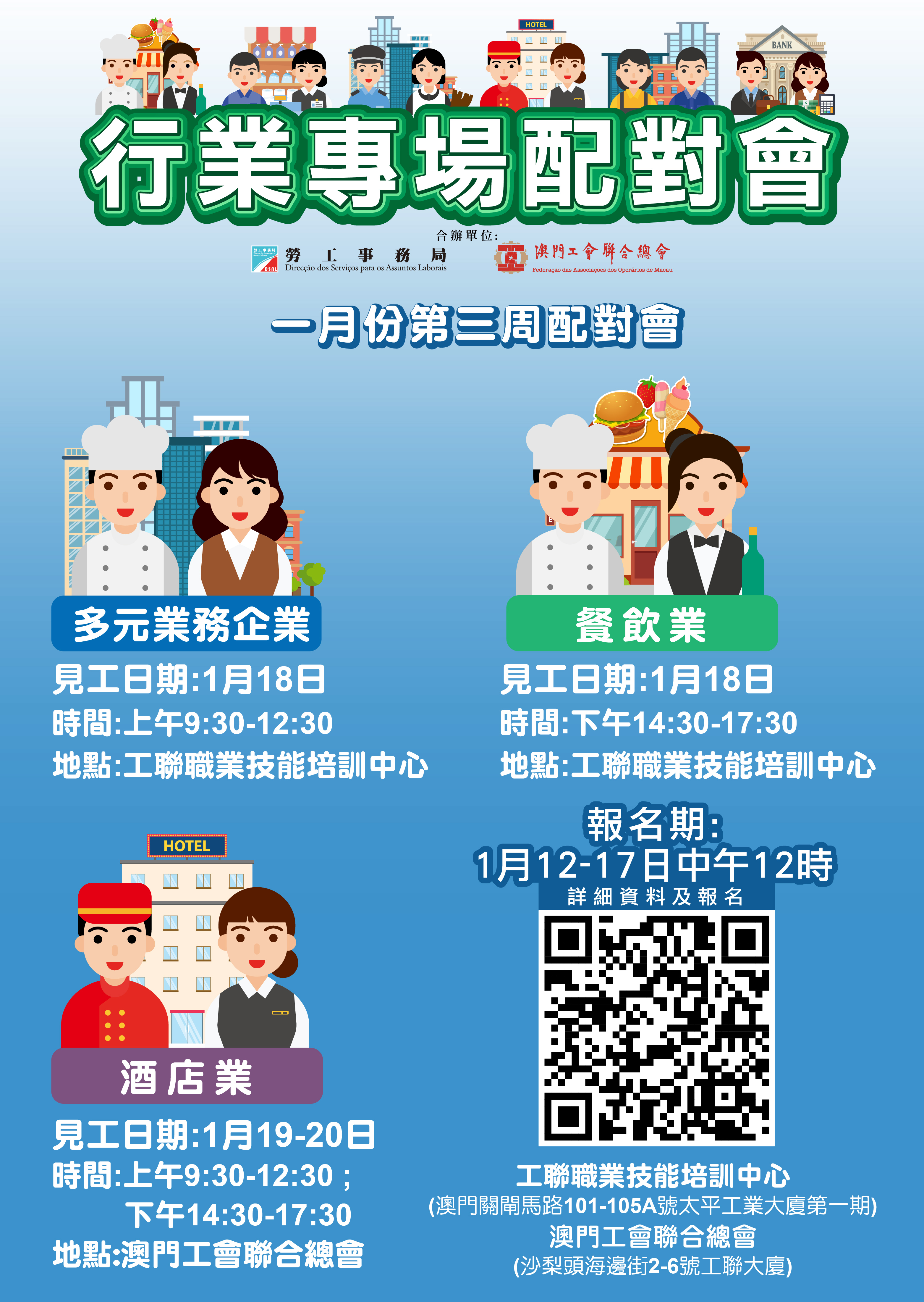 勞工局和工聯會透過短訊通知欲尋找相關工作的求職者,凡收到短訊的求職者或有意參加配對會的澳門居民,可由1月12日至17日中午12時,登入勞工局行業專場配對會專頁(https://www.dsal.gov.mo/zh_tw/standard/indjobfair.html)報名,名額有限,額滿即止。